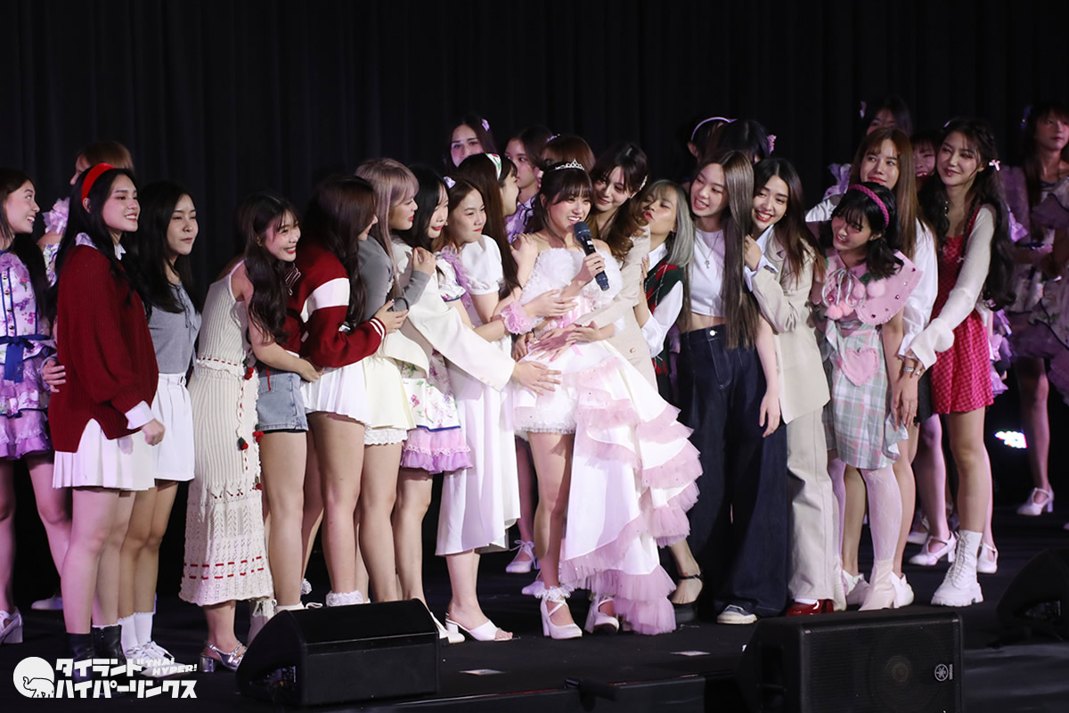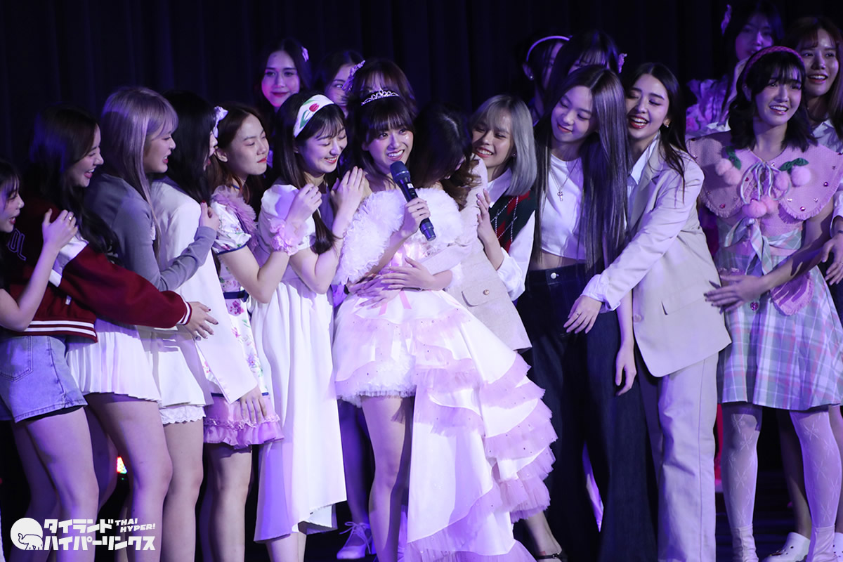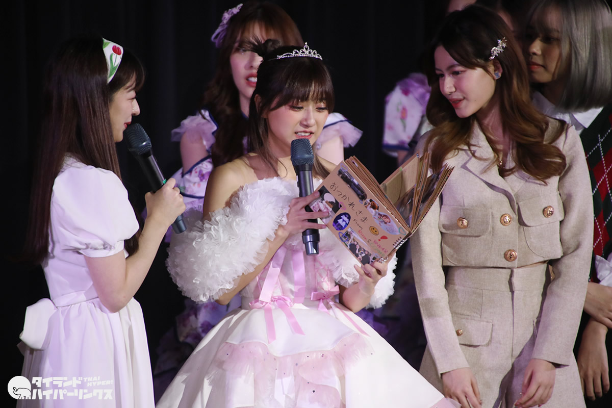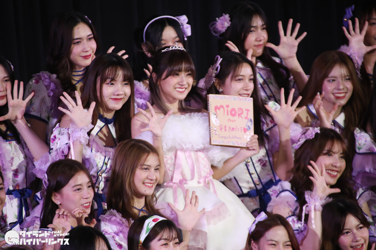 2022年末に1期生の多くが卒業しましたが、ミオリはチャープラン、さっちゃんと共に引き続きBNK48としての活動を継続。1年が過ぎて今回ミオリも卒業を決断し、クリスマスにセレモニーが行われると、卒業したモバイルやパン、ジェニスら大勢の1期生も会場に駆けつけ、ステージでミオリの卒業を祝いました。また、CGM48のイズリナ(伊豆田莉奈)も活動拠点のチェンマイからバンコクへ飛び、思い出の写真が詰まったアルバムをプレゼントしています。さらに日本からAKB48総監督の向井地美音、AKB48の谷口めぐ、STU48の塩井日奈子、元JKT48およびAKB48の仲川遥香がミオリの卒業を祝うビデオメッセージを贈りました。