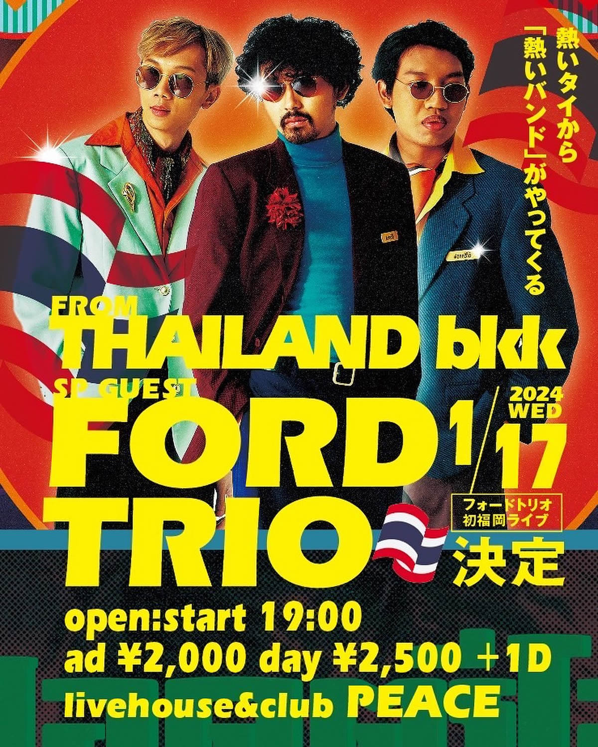 独自のグルーヴに乗せた圧倒的なライブパフォーマンスで観客を次々に虜にするタイのファンクバンド FordTrio が遂に福岡にやってくる。アジアから福岡へ、福岡からアジアへ。タイで熱く盛り上がるインディーズバンドシーンに目を付けた福岡市内のライブハウス Peace による招致パーティとして、一夜限りの特別なライブが決定。