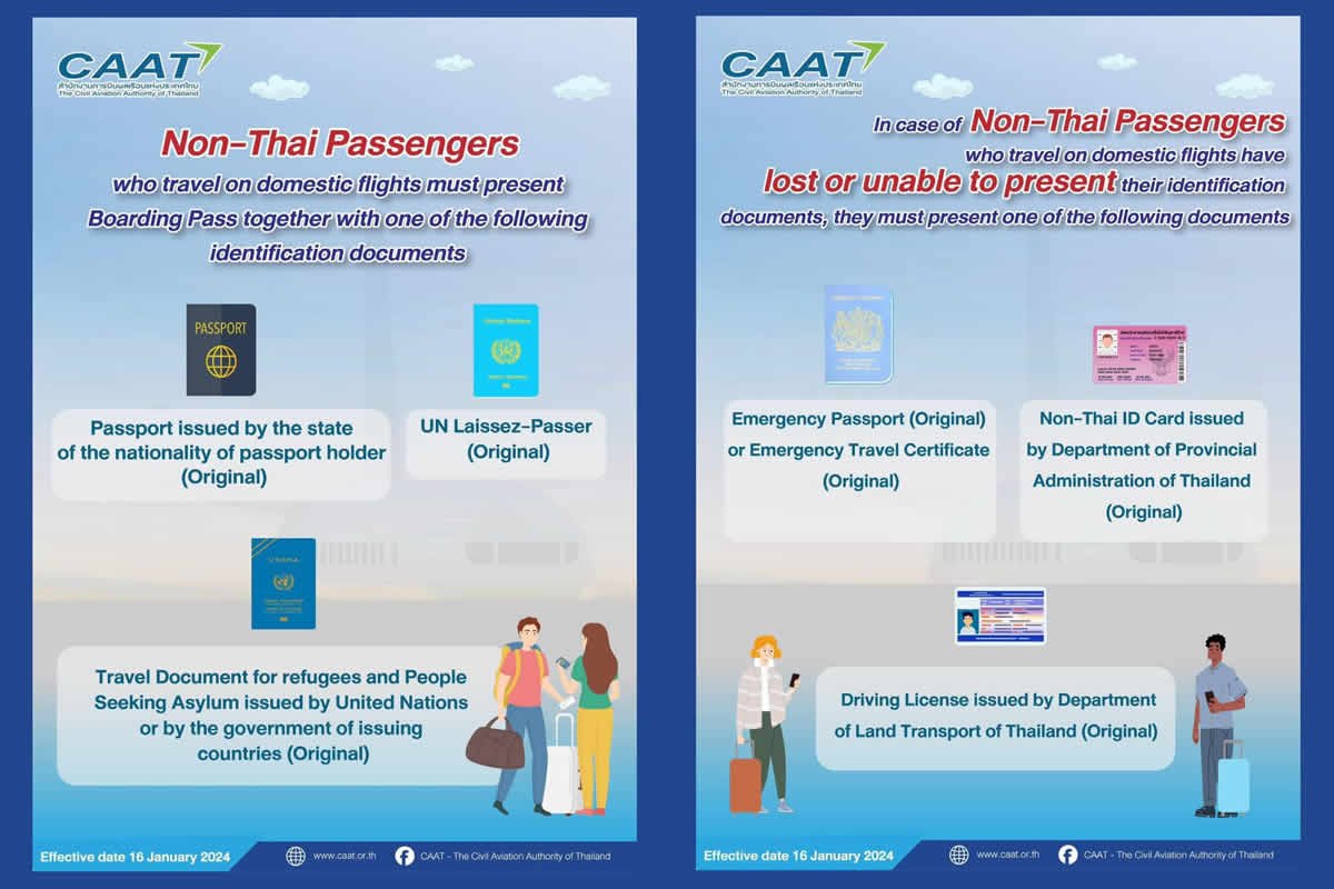 タイ国政府観光庁 (TAT) は、タイ国内線を利用するタイ人以外の乗客に対し、タイ民間航空局が発表した搭乗券と本人確認プロセスに関する規則に従う必要があることを通知しています。2024年1月16日から発効になります。
