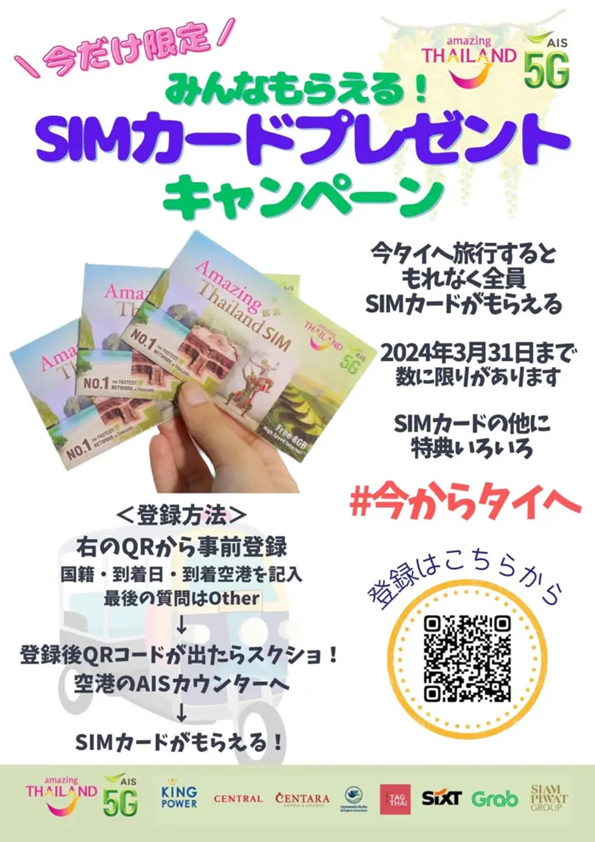 タイ国政府観光庁は2024年3月31日まで、タイ旅行の人々にSIMカードをはじめとするプレゼントキャンペーンを実施中です。どなたでも日本出国前に事前登録をすればタイの到着空港でSIMカードをもらうことができるだけでなく、その他のSIM利用者特典も受けることができます。特典は数に限りがあります。