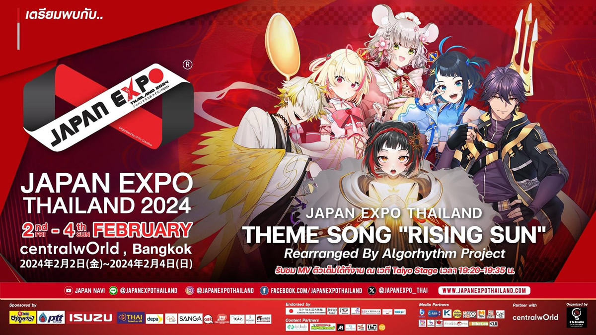 以前より数々のアーティストによる歌唱された「Rising Sun」は、今回は、Dacapo、Zenith、Solar、Karu、Poru、Maylyn の計 6人の有名Vtuberが歌唱。2月2日(金)午後7時20分~7時35分に、「JAPAN EXPO THAILAND2024」のTAIYOステージで披露されます。