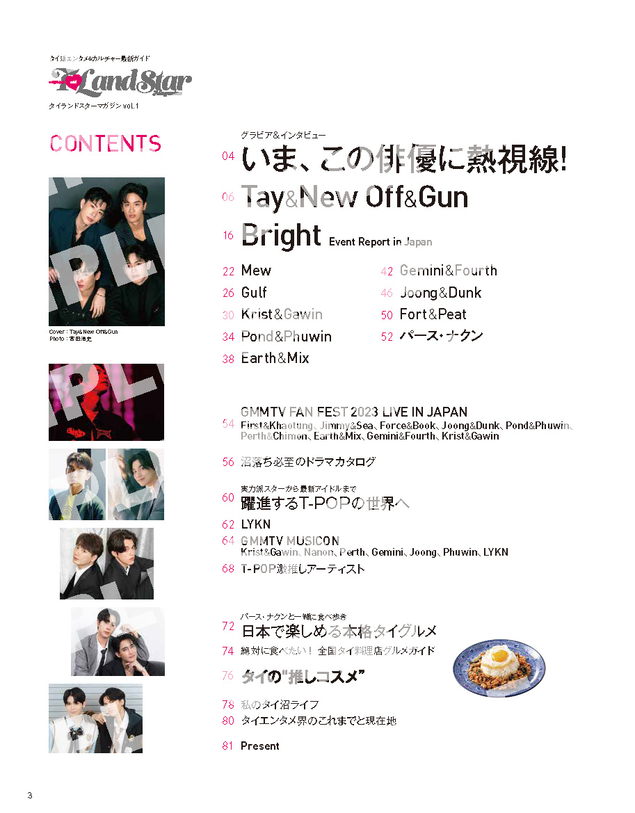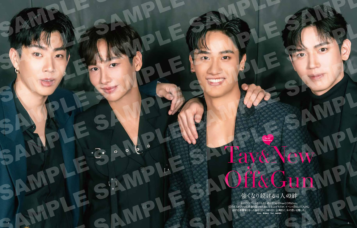巻頭企画では、表紙の4人の撮りおろしグラビア&インタビューをはじめ、その動向が常に注目を集めるトップスター、Brightの来日イベントを追ったスペシャル・フォトレポート、そして、Mew、Gulf、Krist&Gawin、Pond&Phuwin、Earth&Mix、Gemini&Fourth、Joong&Dunk、Fort&Peat、パース・ナクンなど、’24年も活躍が期待される人気俳優約20人の撮りおろしグラビア&インタビューやレポートを掲載しています。