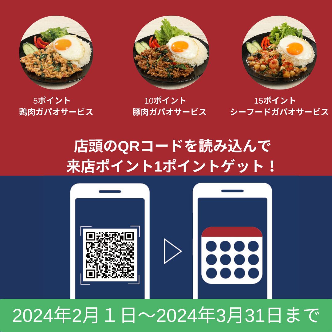 内容:期間内にLINE来店ポイント(1来店1ポイント)をためていただくと5ポイントごとにガパオライスを無料で提供