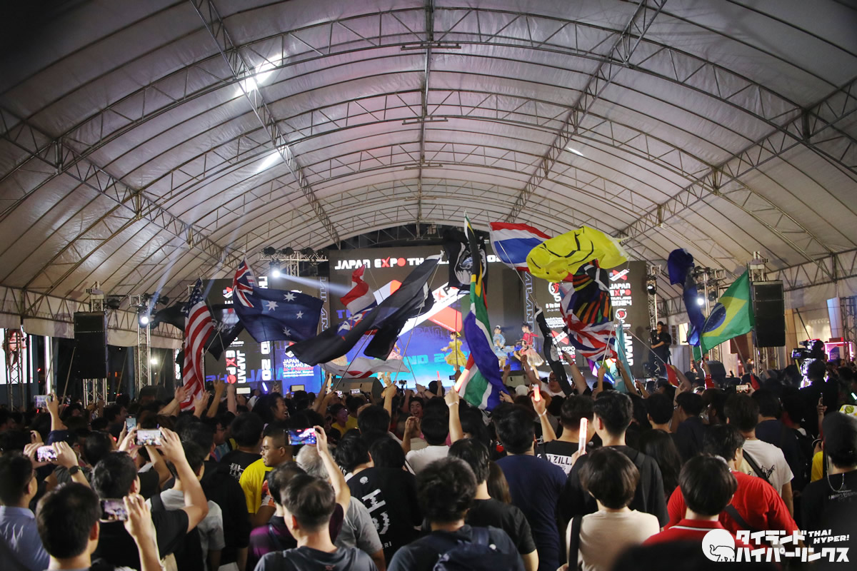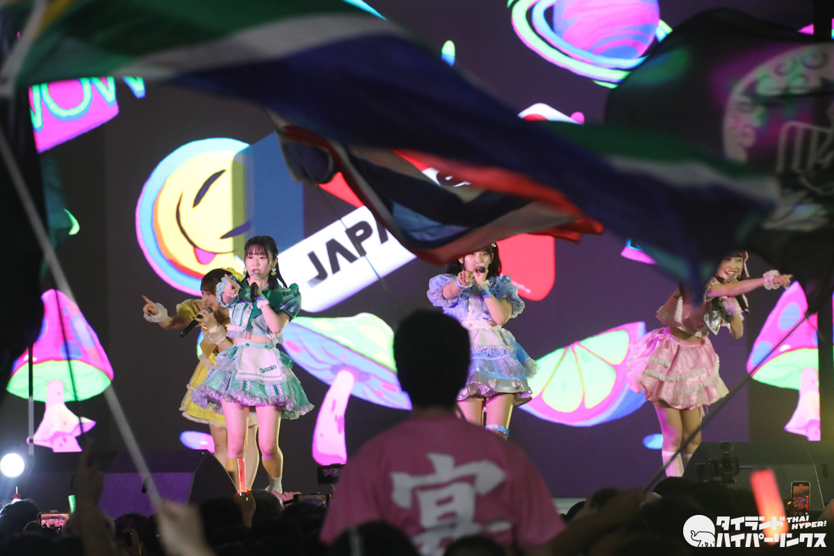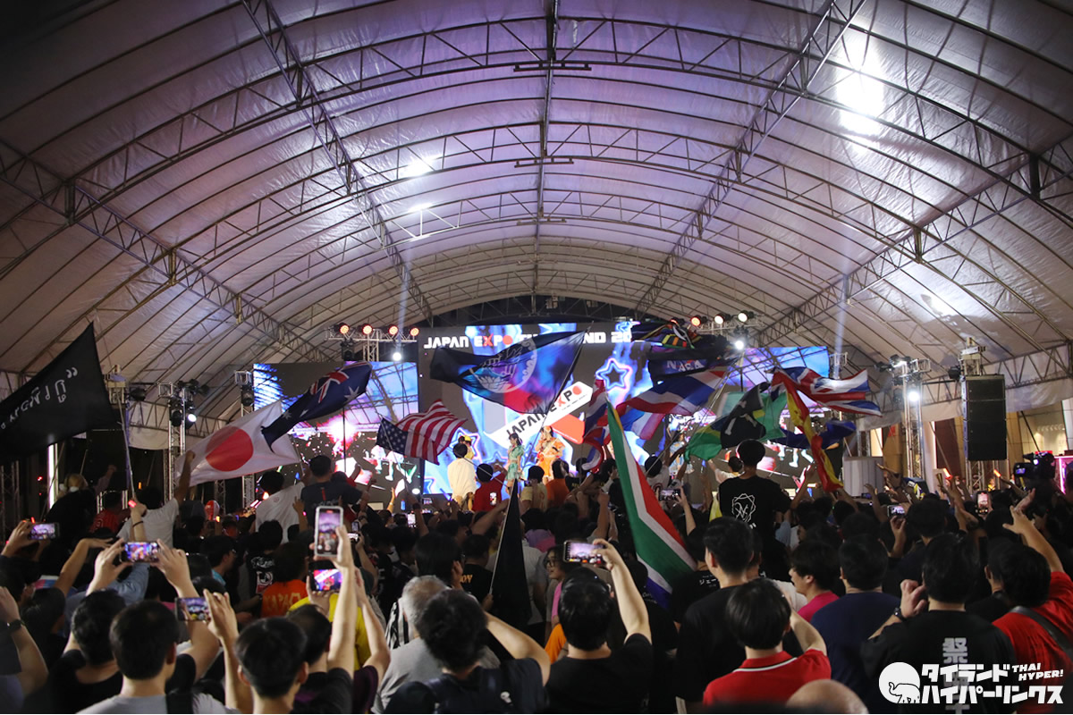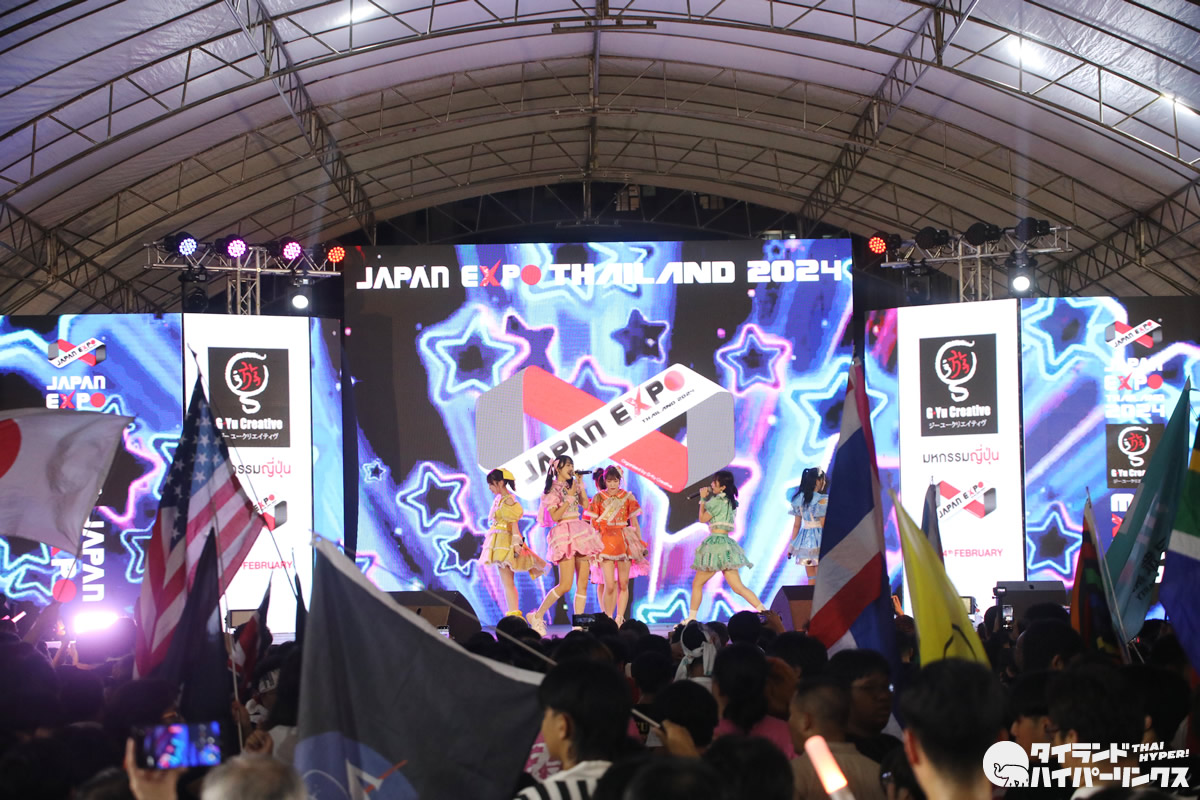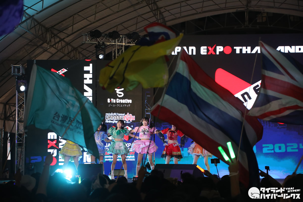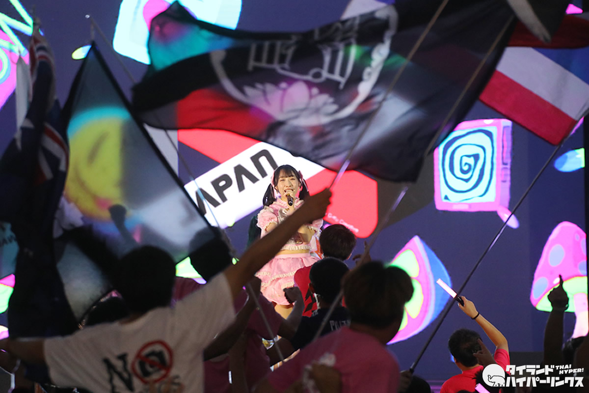 実は本サイトのカメラマンが見たかったのは、大旗がひらめくこの光景でした。FES☆TIVEのライブには大旗が持ち込まれるのが恒例となっており、今回の「ジャパンエキスポタイランド2024」でもたくさんの旗がひらめきました。日本では旗振りが禁止されている会場がほとんどだそうですが、タイは自由。旗に限らず、昔の日本にあったような奔放なアイドルライブの現場がタイにはあるのだといいます。