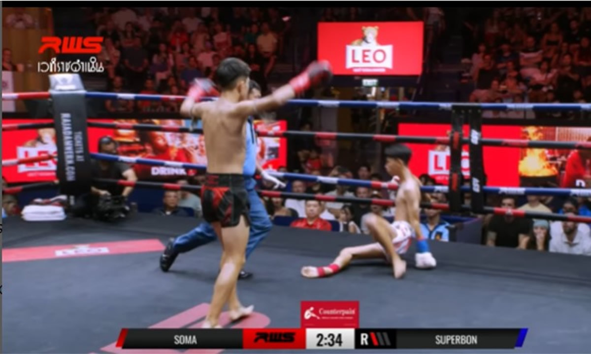 第二試合に出場したそうまは、開始30秒で右ストレートをスーパーボンの右顎に見舞い、ダウンを奪う。続けて1分30秒、右ヒジでまた右の顎に決めてスーパーボンは2度目のダウン。