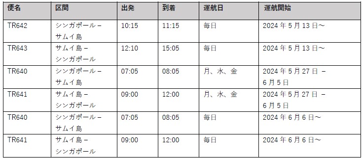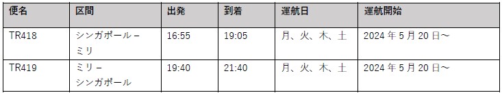 サムイ島へのデイリー運航は2024年5月13日から開始され、同年6月上旬から順次1日2便に増便する予定です。またミリとクアンタンへの便数をそれぞれ2024年5月20日と同年6月3日より既存の週3便から週4便に増便し、シブへは同年6月5日より週3便にて運航を開始します。