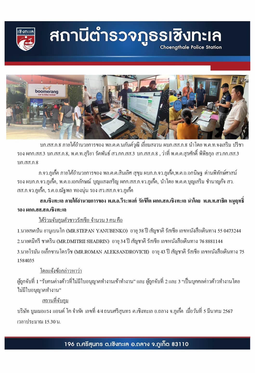 労働許可なく働いている外国人がいるとの通報を受けた警察が捜査を開始。チャーンタレ―のSrisoonthorn通りにある「Boomerang Car & bike rent」を摘発し、ロシア人3人を逮捕しました。