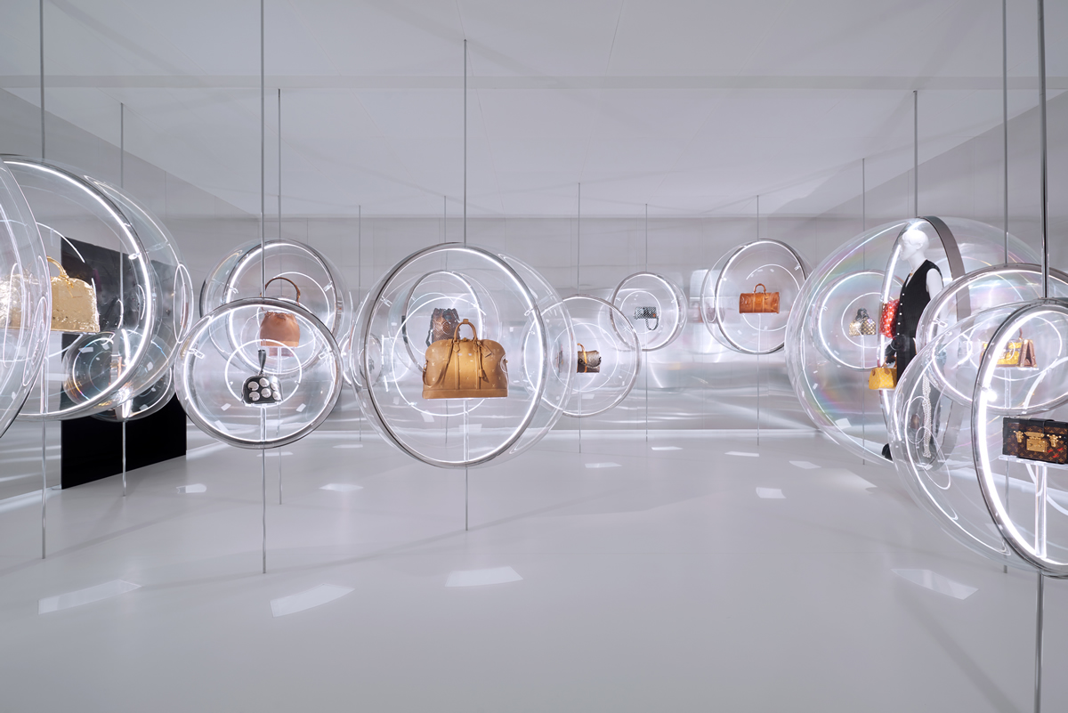 「Iconic Bags」のルームでは、さまざまなアイコンのユニークな形やフォルム、そして重要性を伝えるためにバッグ21点とプレタポルテ2ルックを展示。それらを閉じ込めた透明なアクリルバブルがバッグの形とフォルムを際立たせます。空中に吊り下げられた ルイ・ヴィトンの影響力を感じさせるいくつもの球体は、時を超えた発明とその集合的なストーリーを星空のように表現しています。