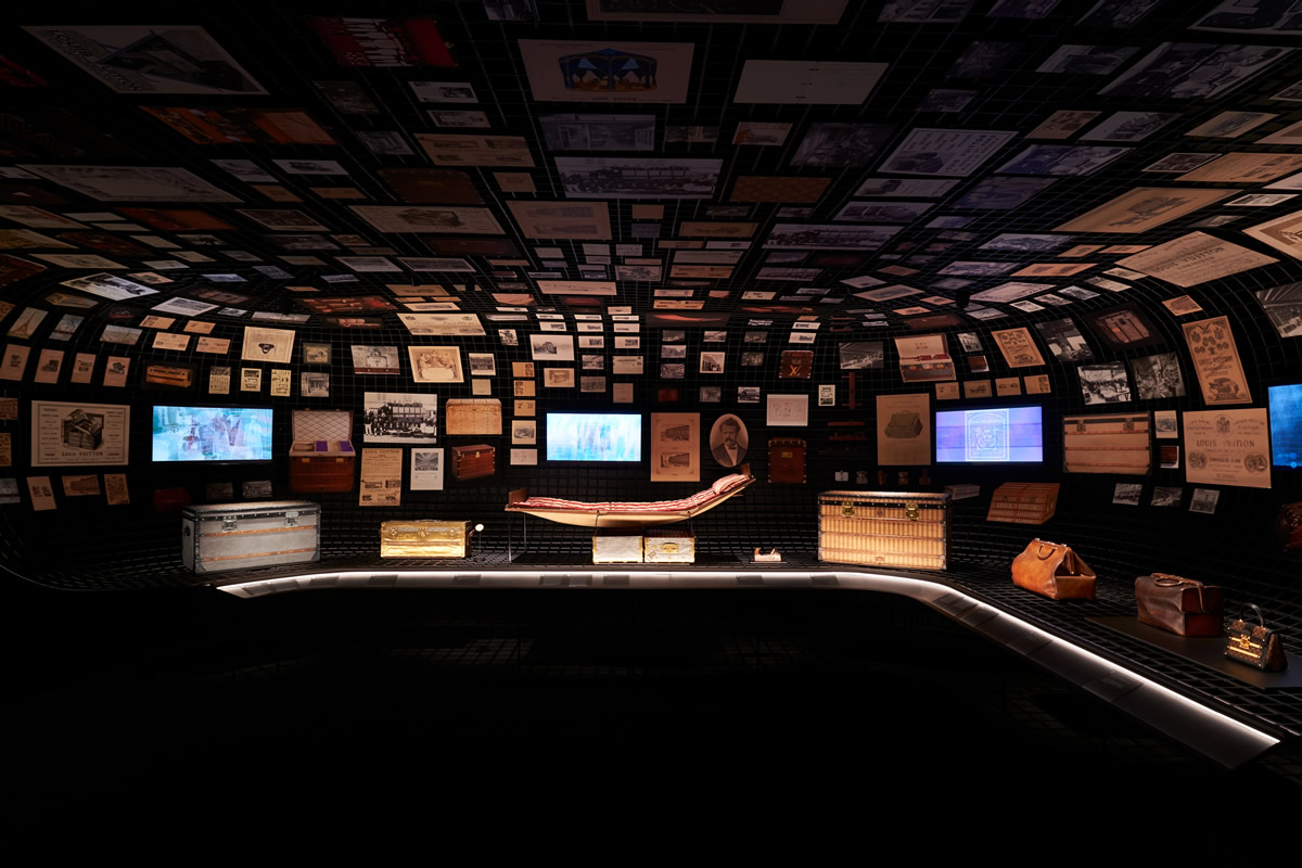 「Origins」のルームでは、サヴォアフェール(匠の技)、革新、旅、創造性という創業時から続く4つの柱を通じて、ヴィトン家がメゾンにもたらした具体的かつ顕著な貢献に焦点を当てます。クリエイティブなアイディアに溢れる人物たちによる歴史の集合体を物語る何百もの文書のレプリカや42の作品が展示されたルームは、全体が生きたアーカイヴ、まさに好奇心を掻き立てるアイテムを集めたキャビネットです。過去のアーカイヴを静的に展示するのではなく、平面と立体を組み合わせた造作、ケース、テキスト、そしてビデオスクリーンが、3次元の格子状の骨組みに散りばめられたハイブリッドなディスプレイとなっています。ビジョナリーたちが紡いできたルイ・ヴィトンのストーリーが詰まった書籍で図書館のように取囲まれた空間は、記憶や知識、そしてイマジネーションで鑑賞者を包み込むでしょう。