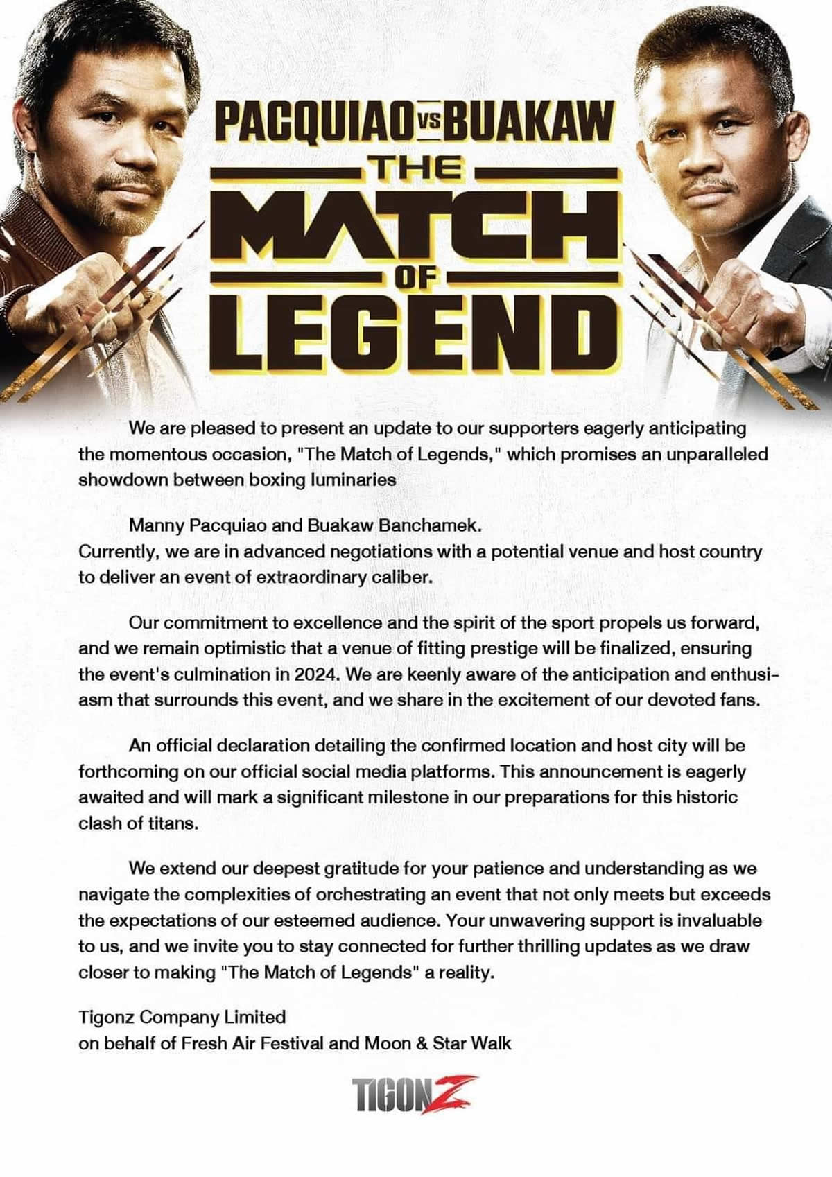 元K1王者のタイの英雄ブアカーオ・バンチャメーク(41歳)と世界6階級制覇を成し遂げたフィリピンの英雄マニー・パッキャオ(45歳)が対戦する「The Match of Legend」の開催が、当初発表された2024年4月20日(土)から延期されました。