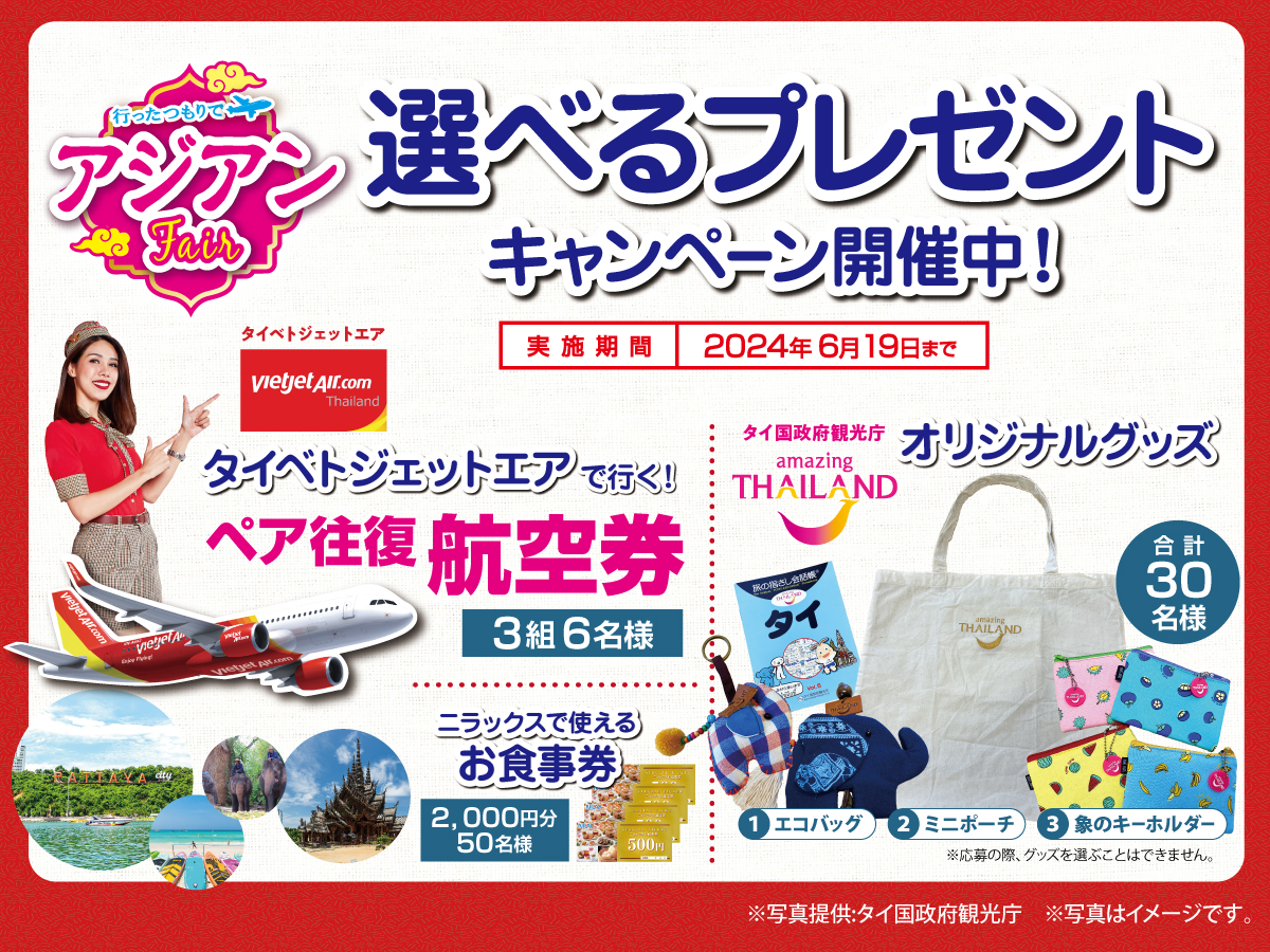 ベトジェットエアで行く3組6名様ペア航空券や、タイ国政府観光庁オリジナルグッズ(合計30名様)が当たる!?プレゼントキャンペーンも同時開催です。