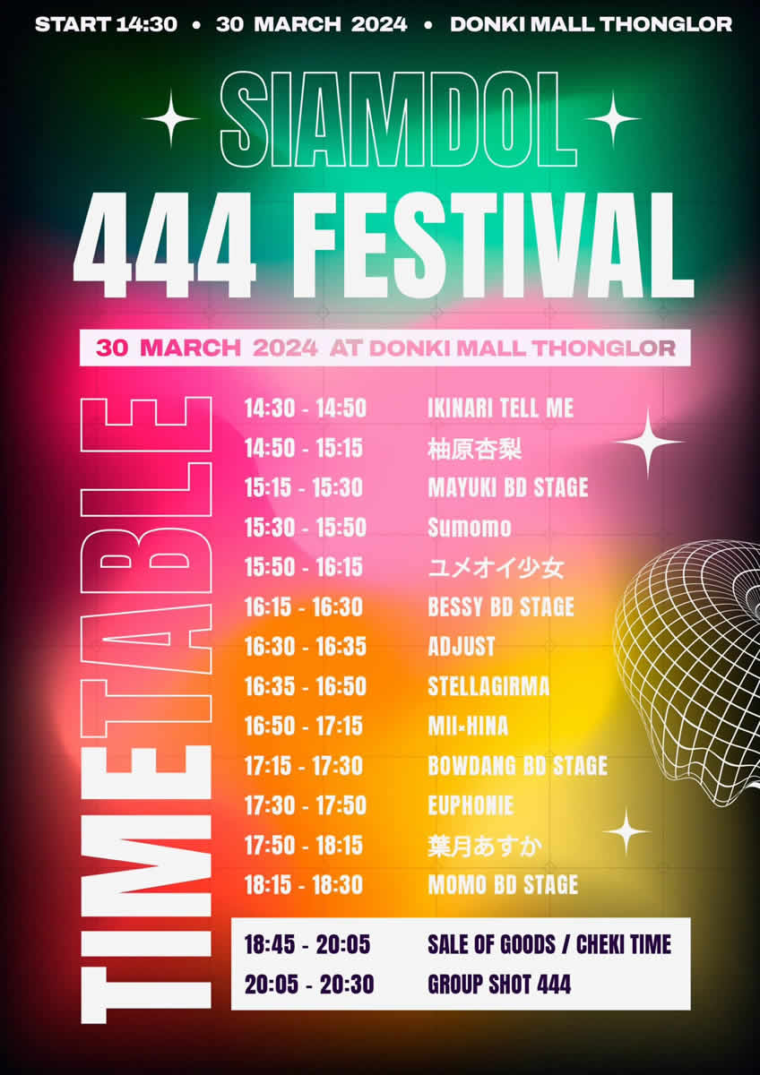 『SIAMDOL 444 FESTIVAL』には、タイのアイドル4組<Sumomo、Euphonie☆、Stellagrima*、Ikinari Tell Me>と日本のアイドル4組<葉月あすか、ユメオイ少女、柚原杏梨、MII&HINA(田口未彩 計良日向子)>が出演。さらにタイのアイドル4人<マユキ、ベシ―、ボーダン、モモ>の生誕ステージも行われます。
