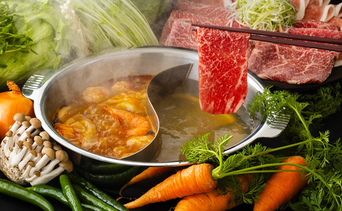 ①厳選したお肉と国産野菜を、2つのスープで自由に楽しむ「新MK鍋」