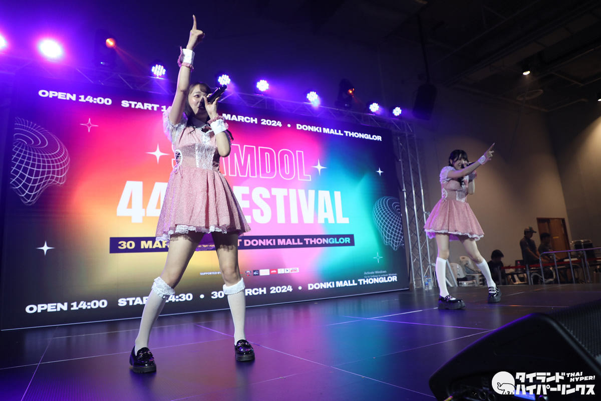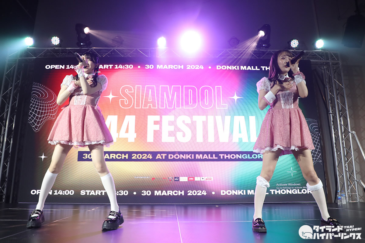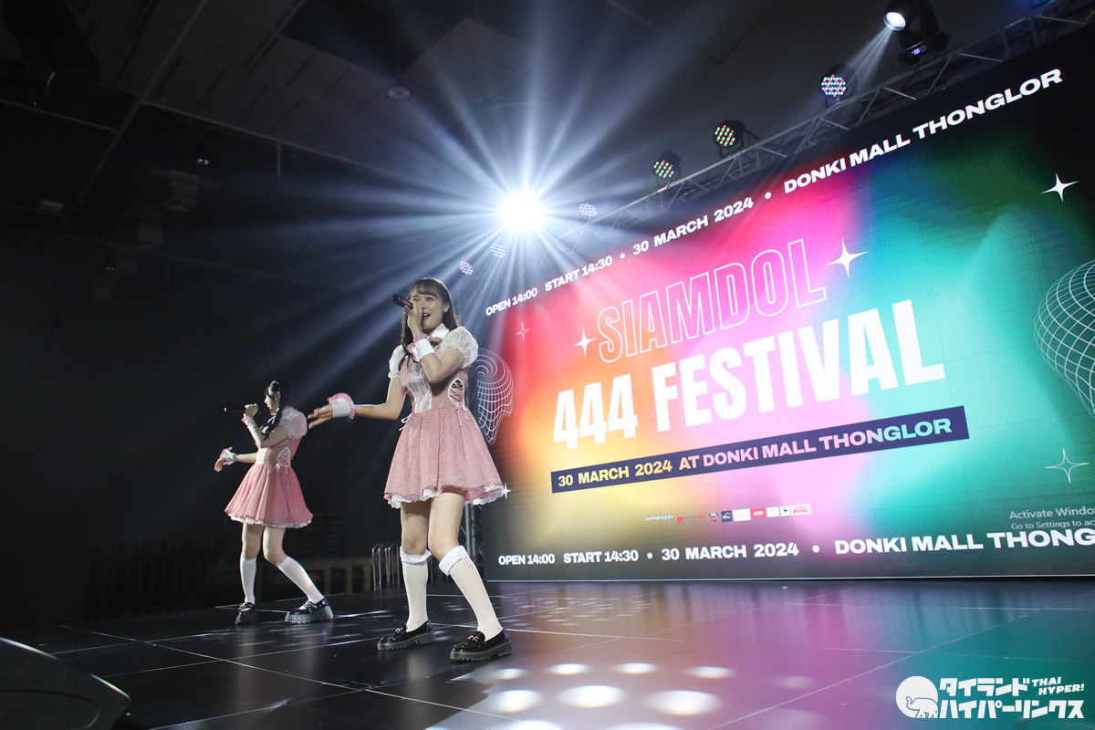バンコクのドンキモール・トンロー4階のホールで2024年3月30日(土)、日タイのアイドル8組が出演したアイドル対バンライブ「SIAMDOL 444 FESTIVAL」が開催。 MII×HINAがステージに登場しました。