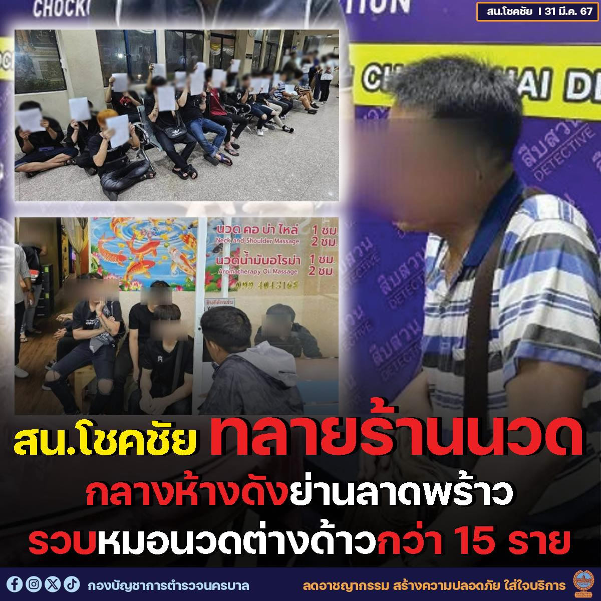 タイ警察チョクチャイ署は2024年3月29日、タイ式マッサージ店が許可なく外国人を雇用しているとの通報を受け、BigCラプラオ店内のマッサージ店「Uncle Ood Massage」の捜査を実施。不法就労していたミャンマー人15人を逮捕しました。タイではマッサージ師はタイ人のみが就ける仕事とされ、外国人の就労は許可されていません。