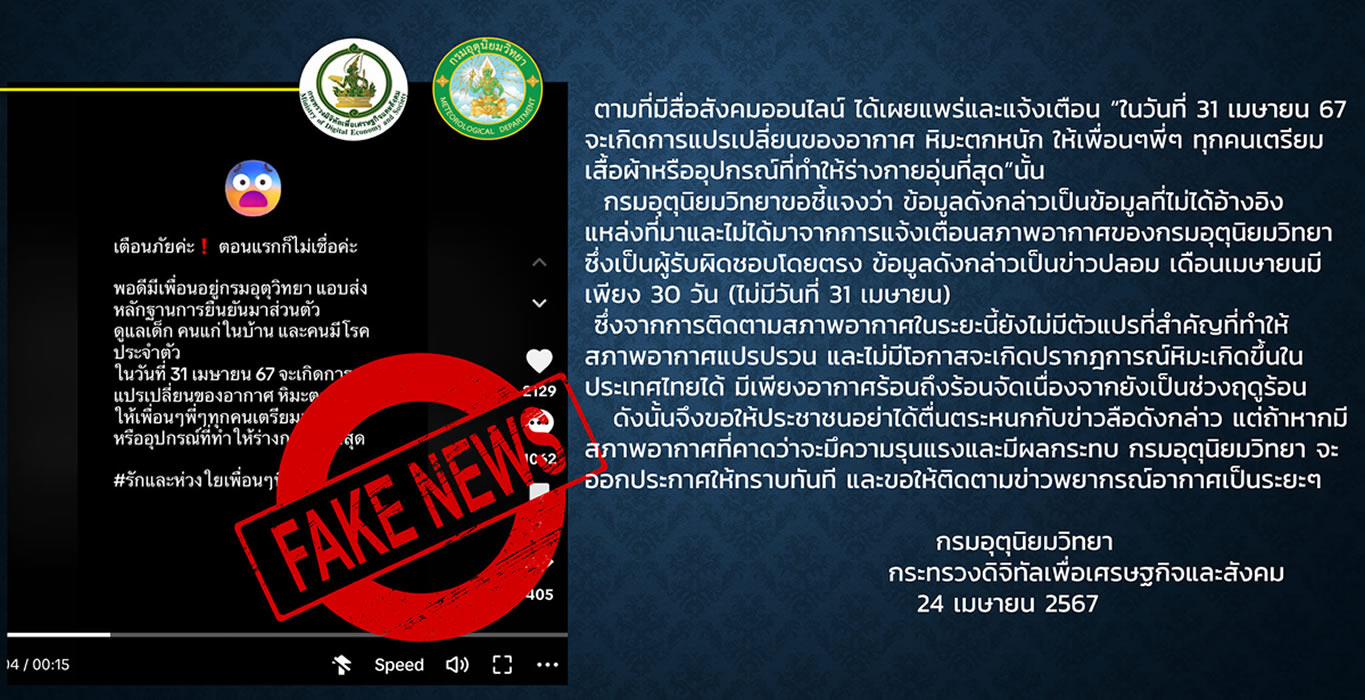 SNSでは『2024年4月31日に気象が変動し、大雪が降る。皆さん、最も暖かい服や装備を準備してください』という情報が拡散されています。タイ気象局は、この情報の出典が不明であり、気象局からのものではないことを強調して注意を呼びかけています。