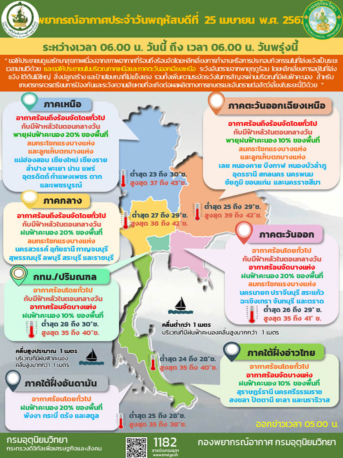 タイ気象局は2024年4月25日午前6時に、1日に天気予報を発表しました。連日猛暑が続き、この2ヶ月で30人が熱中症で死亡したタイですが、4月25日も全国的に暑くなります。