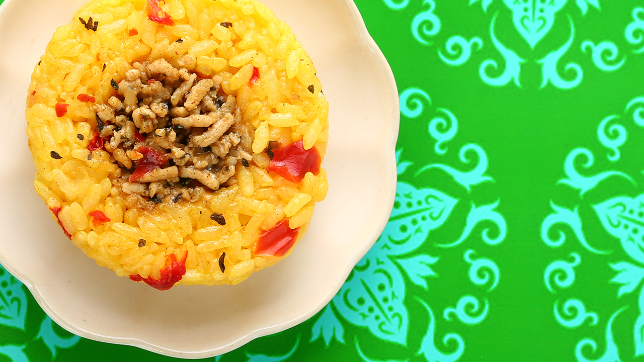 タイ料理でおなじみの「ガパオ」をおにぎりにしました。鶏ひき肉と野菜のバジル炒めに卵黄ソースを加え、イエローライスにトッピングしたおにぎりです。ワンハンドで「ガパオライス」が楽しめます。