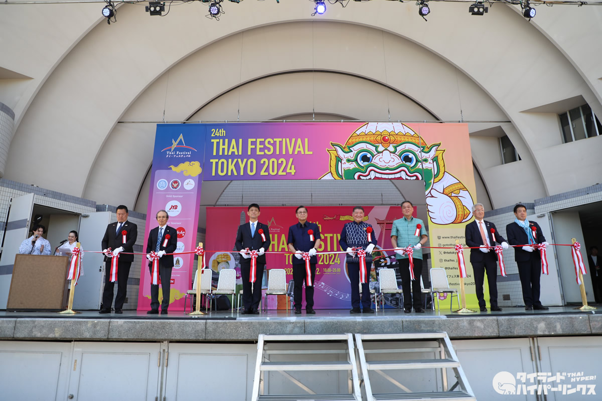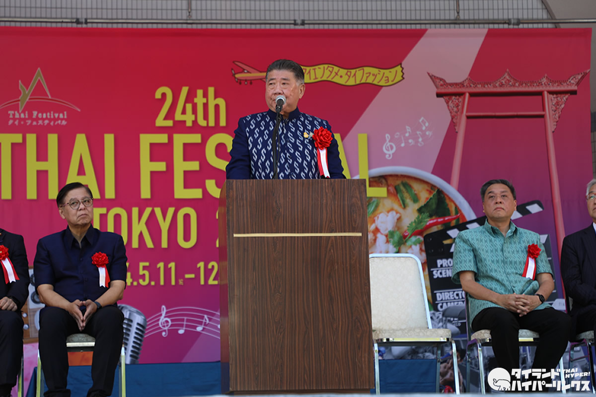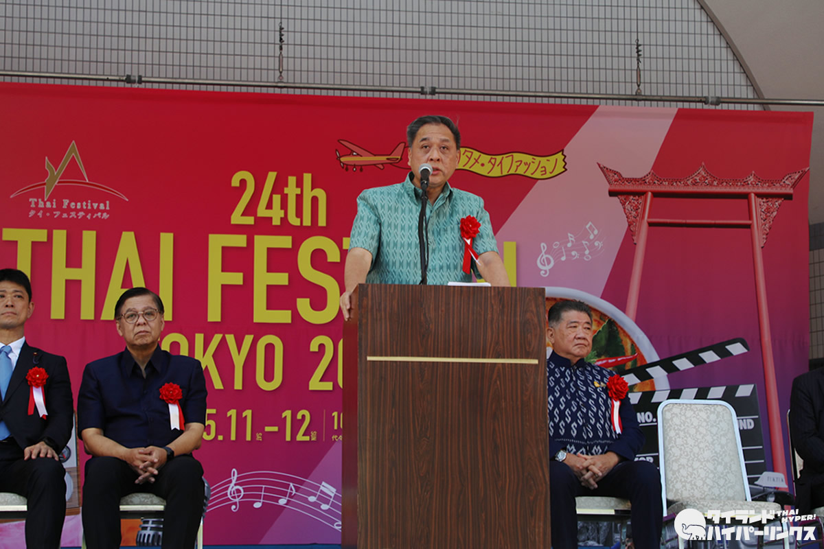 「第24回タイフェスティバル東京へようこそお越し下さいました。オープニングセレモニーにご出席頂き、誠にありがとうございます。今日と明日のフェスティバルの様々なイベントを皆様が存分に楽しんで頂けることを願っています。日本とタイは、タイのアユタヤ時代から400年以上にわたって交流と協力を続けてきた友好国であり、両国は様々な活動を通じて今年で137年に及ぶ外交関係を築いてきました。東京のタイ王国大使館は毎年、両国国民間に親密さと友情を育むことを目的として、楽しい文化、エキサイティングなタイのスポーツ、美味しいタイ料理や様々な形でタイらしさを紹介するイベントを開催したり、サポートをしています。これは両国の相互評価と経済にプラスの影響を及ぼしており、タイと日本間の貿易及び投資額、観光客数の増加に反映しています。したがって、タイフェスティバルを始めとする文化イベントは、今後将来的にタイと日本の関係を強化する要素であると言えます。2000年に東京で初めてタイフェスティバルが開催され、20年以上にわたり日本人だけでなく日本在住の外国人からも温かい歓迎を受け、タイフェスティバルは東京で開催される最も人気のある海外のフェスティバルのひとつになりました。昨年タイフェスティバル東京は4年ぶりに通常開催となり、20年以上前に開催された第1回タイフェスティバルの10倍となる30万人もの来場者を集めました。毎年、タイ文化や日本人に知って頂きたいタイのクオリティーや独自性のある商品やサービスを紹介するためにタイフェスティバルが開催されます。郷土芸能、美術工芸品、料理、果物、加工食品、タイ式マッサージ、観光等です。今年、タイ政府は、これまで皆さんが親しんできたタイに加えて、世界に向けて新たな側面のタイらしさをPRする政策を立てています。タイフェスティバル東京もこの方針に沿い、今年のテーマは「タイエンタメ」、「タイエンターテインメント」です。タイのエンターテインメント産業には様々なジャンルがありますが、ドラマシリーズ、映画、バンド、歌手や俳優のグループ等日本のみならず海外でも人気が高まっています。そこで、もう一度タイフェスティバルを通じて、タイのエンターテインメント産業の魅力に触れて頂きたいと思います。今年のフェスティバルのもうひとつの目玉は、タイファッションのブースで、シリワンナワリー王女殿下の庇護の下でタイのファッション製品を紹介します。王室の取り組みである「タイファッションを楽しむ」の展示・販売が外国で開催されるのは初めてです。このプロジェクトは、環境に優しいプロセスで生地を生産し、地方の生地を縫製によって現代的なものに仕上げ、普段使いに適したものにしています。地方の女性やコミュニティの収入創出に貢献するだけでなく、高品質な手工芸品を使用する消費者に幸福をもたらし、タイの織物を世界に認知してもらえます。過去数年間私達のイベントをご覧になっている方々は、様々なタイらしさを紹介する「5月はTHAI Month」キャンペーンが、5月と6月の2ヶ月間、東京や他の都市で繰り広げられ、タイフェスティバル東京がスタートであることをご存知でしょう。最後に、タイフェスティバル東京のためにご尽力頂いた関係機関の皆様に感謝申し上げます。第24回も無事開催の日を迎えました。本日はご参加頂き、誠にありがとうございました。」