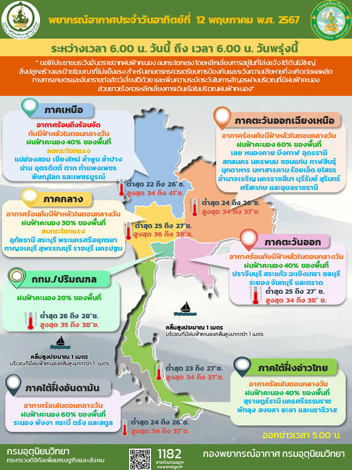 暑く、ヘイズが発生しています。ルーイ、ノンカーイ、ブンカン、ウドンタニ、サコンナコン、ナコーンパノム、コンケン、カラシン、ムクダハン、マハーサラカーム、ローイエット、ヤーソートン、アムナートチャルーン、ナコンラチャシマ、ブリラム、スリン、シーサケート、ウボンラチャタニで主に散発的な雷雨が発生します。最低気温は24-26°C、最高気温は34-37°C。西風が10-20 km/hで吹きます。