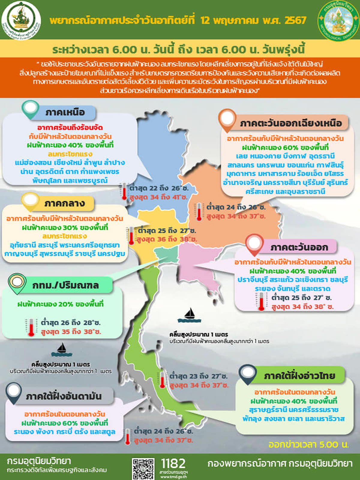 晴れ。ペチャブリー、プラチュワップキリーカン、チュムポーン、スラタニ、ナコンシータマラートで孤立した雷雨と大雨があります。最低気温25-27℃。最高気温34-38℃。南東の風10-30 km/時。雷雨時に波の高さ1メートル以下および1メートル以上。