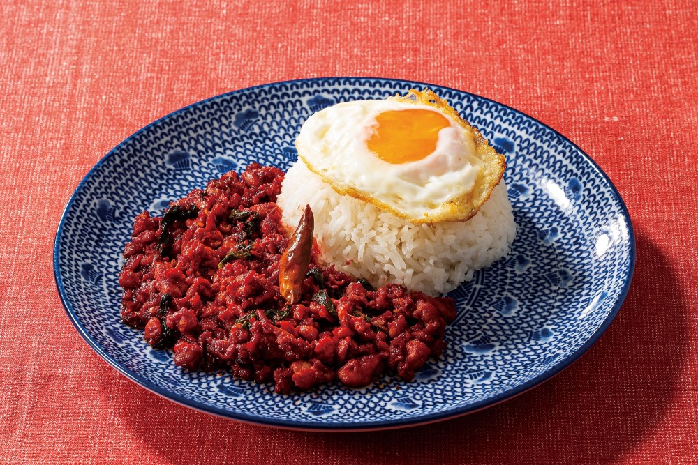 ビーツとパプリカとたっぷりの唐辛子を使い、真っ赤な見た目からも辛さを想起する鶏のガパオ炒めは、一口頬張れば思わず汗ばむ旨辛仕立て。揚げた目玉焼きをくずせば、まろやかな味わいに。