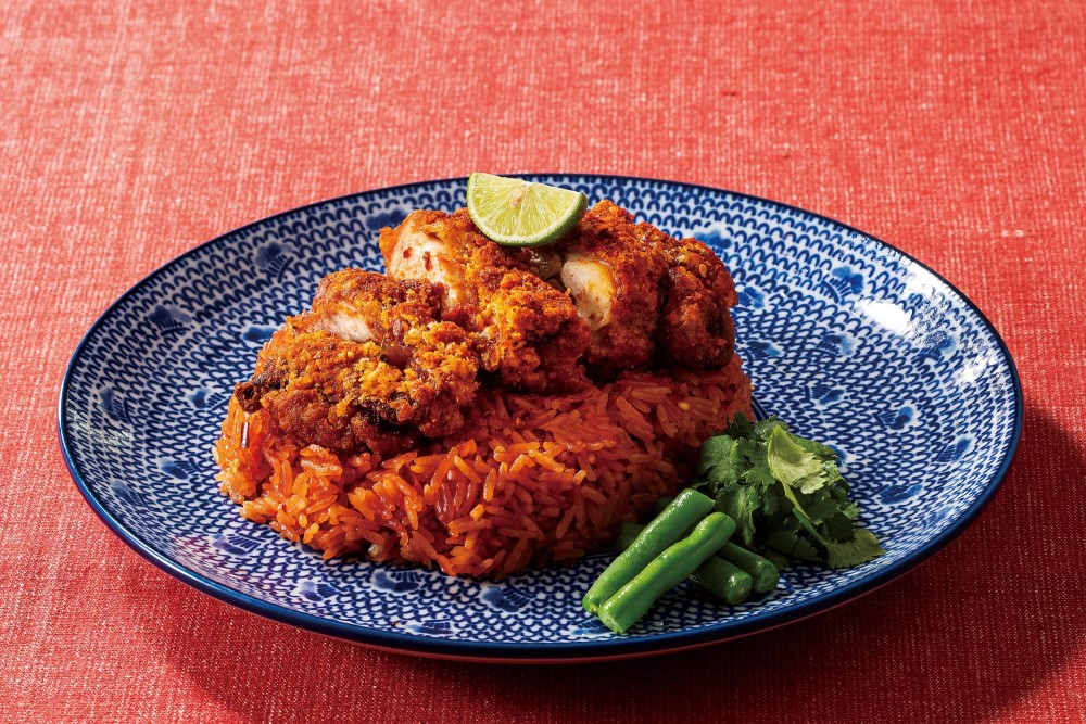 唐辛子とビーツ、チキンスープで炊きこんだ真っ赤なジャスミンライスに、特製レッドスパイスをまぶし、ザクザク衣の食感とスパイシーなフライドチキンの旨辛カオマンガイ。