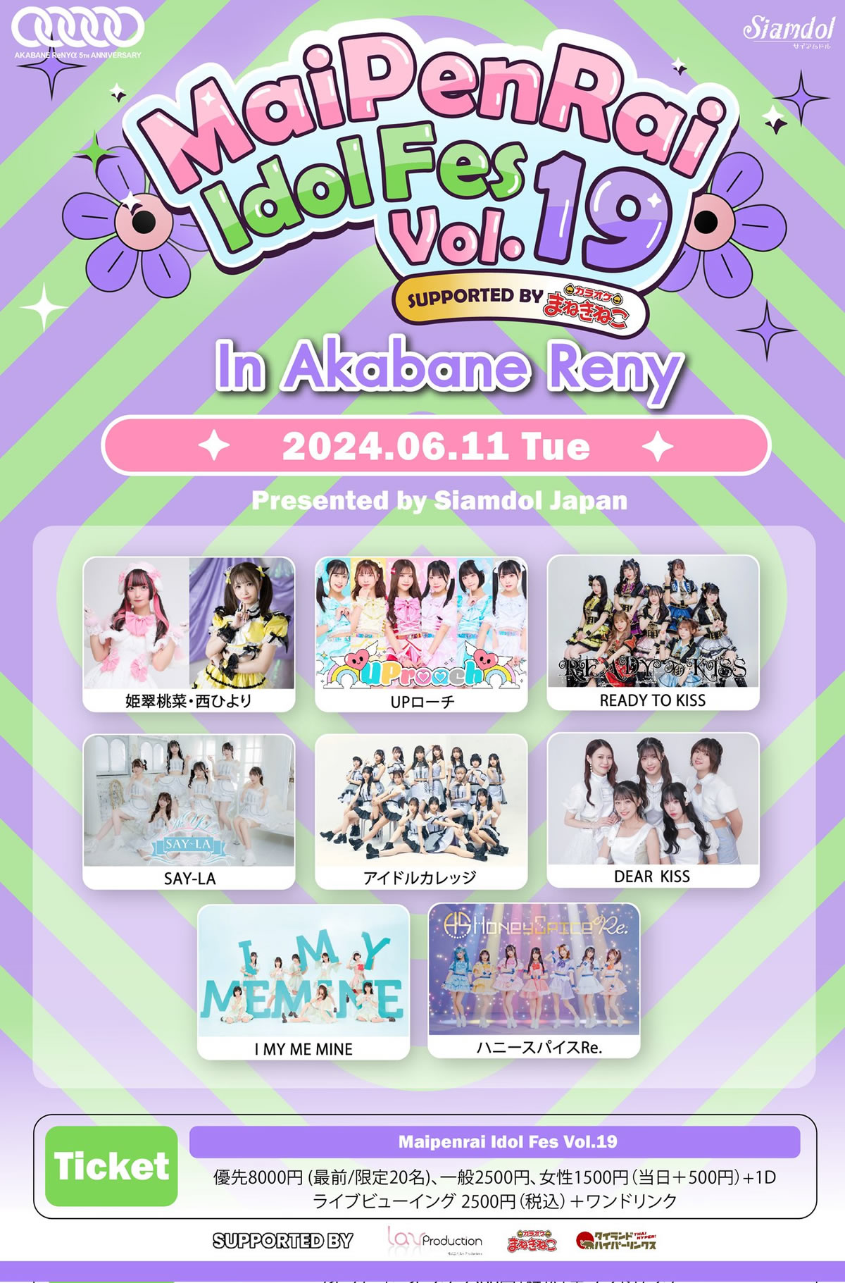 タイから日本に進出したサイアムドルが主催のアイドル対バンライブ「Maipenrai Idol Fes Vol.19 Supported by カラオケまねきねこ」が、2024年6月11日(火)に東京・赤羽のAkabane ReNY alphaで開催されます。