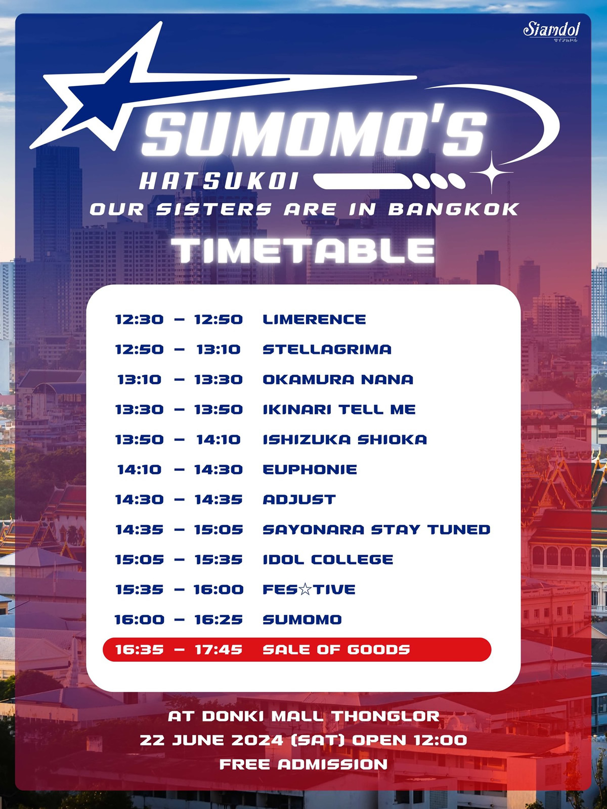 『Sumomo’s Hatsukoi: our sisters are in Bangkok』では、Sumomoの新メンバー2名がお披露目される他、Sumomoの姉妹グループであるFES☆TIVEの出演も決定。さらに日本からは度々タイ遠征を行っているアイドルカレッジ、石塚汐花、初のタイ遠征となるさよならステイチューン、そしてNHKでタイでの活動がドキュメンタリーとして放送された岡村茉奈が出演。タイからはEuphonie☆、Stellagrima*、Ikinari Tell Me、そして先のタイフェスティバル東京にもラインナップされたLIMERENCEが出演します。