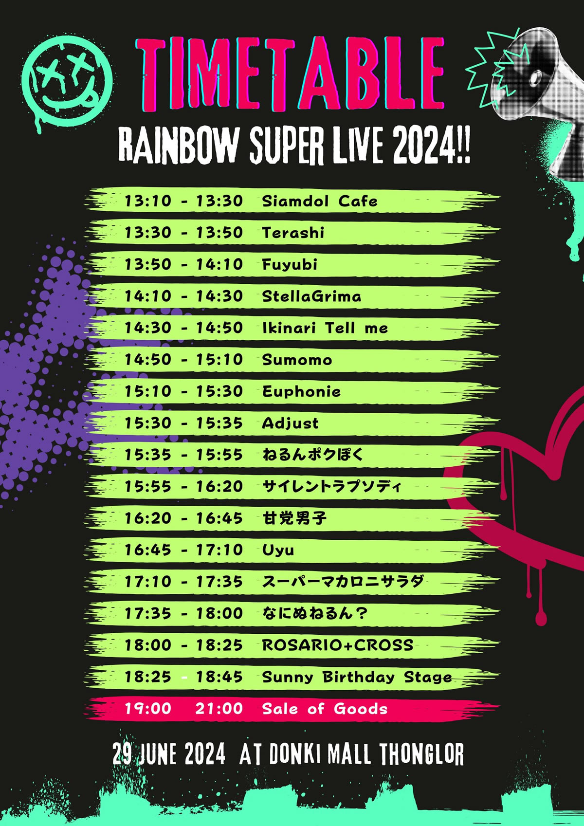 日タイのアイドルグループ 14組が出演するアイドル対バンライブ Siamdol presents『Rainbow Super Live』が、バンコクのドンキモール・トンローで2024年6月29日(土)に開催されます。一般は入場無料。