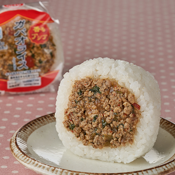 【内容】タイの人気料理「ガパオライス」のおむすびです。鶏肉を、ナンプラーやオイスターソース、ホーリーバジル、バジルピューレを使用して炒め、独特の香りと、ピリ辛な味わいに。お肉の下の卵黄ソースで、味わいの変化もお楽しみいただけます。