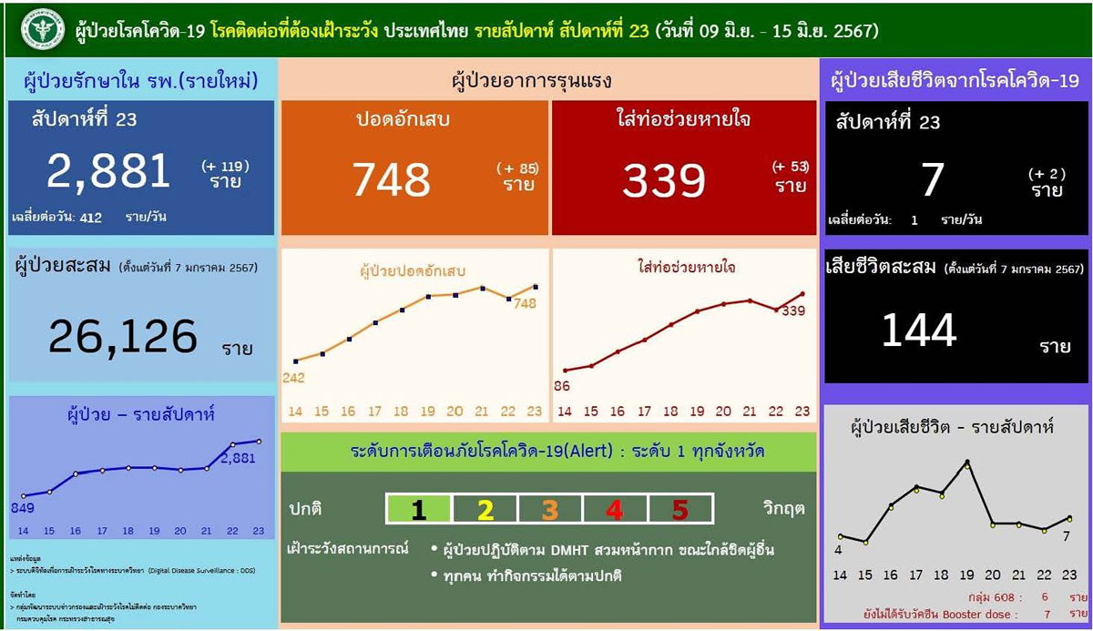 タイ保健省疾病管理局によると、2024年6月9日から6月15日までの1週間で、新型コロナウイルスに感染して入院したのは2,881人でした。そのうち748人は重度の肺炎で、挿管が必要な患者が339人です。