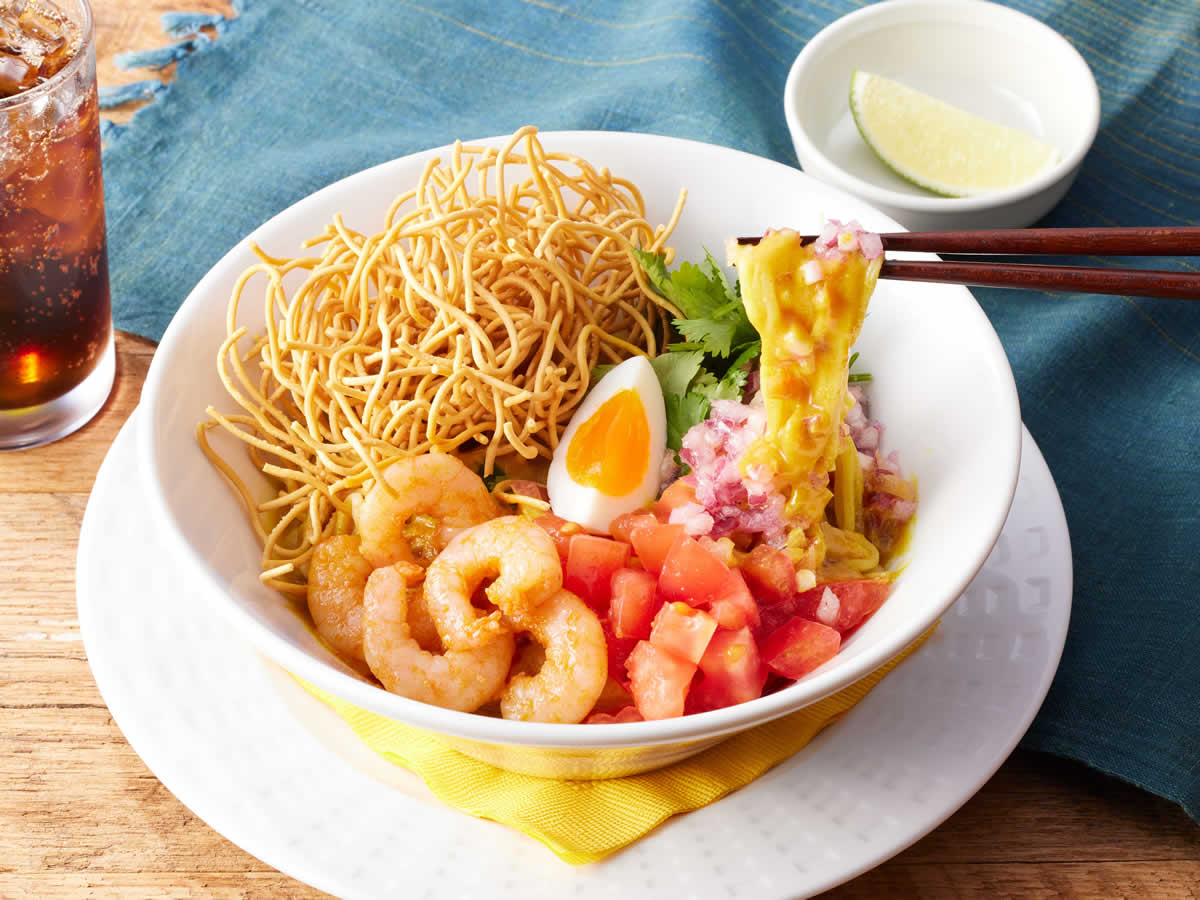 レモングラスの爽やかな風味が感じられるカレースープは、7種類のスパイスやココナッツミルク、ナンプラーが織りなす程よい辛味と酸味がやみつきになる味わいです。パリパリの麺を崩し、ぷりっとした海老やフレッシュなトマト、赤玉ねぎ、パクチーとよく混ぜてお召し上がりください。