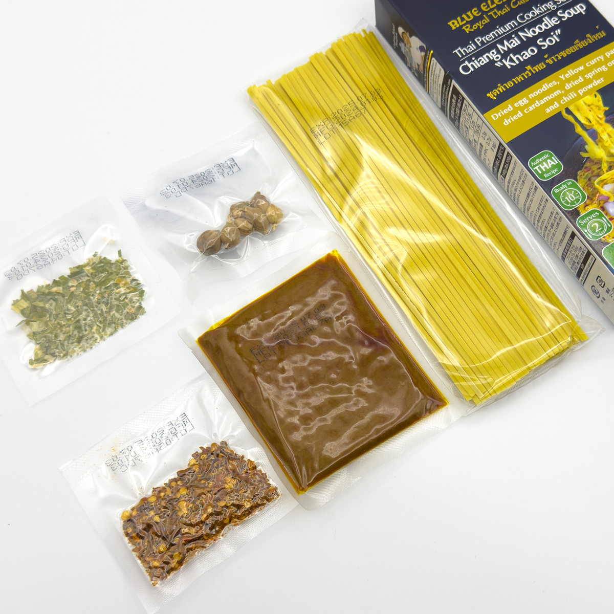 今回発売した「カオソーイ クッキングセット140g」には乾燥卵麺、スープペースト、乾燥ねぎ、乾燥カルダモン、チリパウダーが同梱されています。