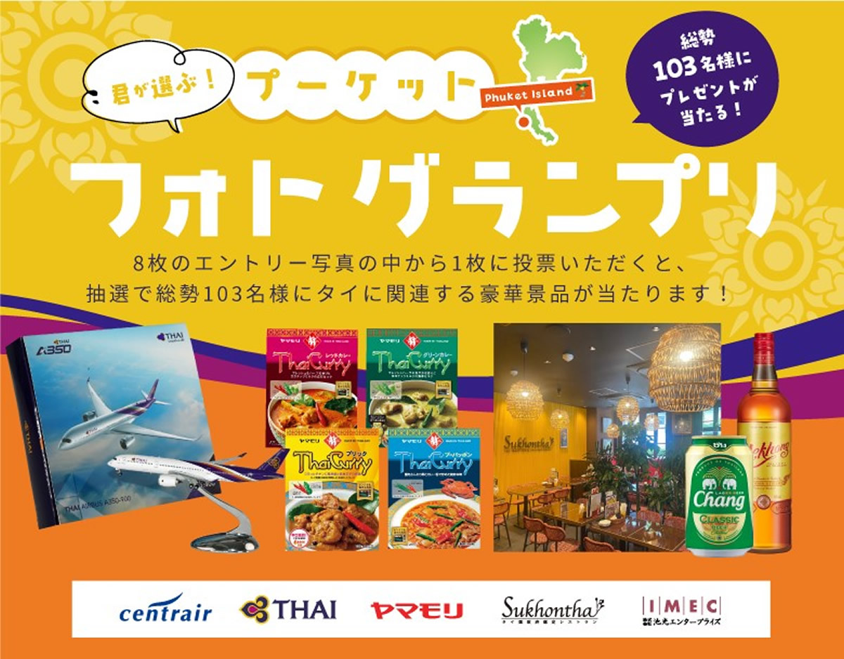 この企画は、「タイが君を待っている。~プーケット編~」の一環として実施します。2024年5月に実施したプーケットモニターツアーに参加したモニターの8名の方がプーケットで撮影した渾身の写真の中から、投票する1枚を選び、簡単なアンケートに回答することで、抽選で103名様にプレゼントが当たります。プレゼントは、タイ国際航空のモデルプレーンやトートバッグ、プーケットのお土産詰め合わせ、タイカレーとガパオセット、タイ料理店 スコンターお食事券、チャーンビールまたはスピリッツメコンで、中部地域の皆様にプーケット旅行の魅力を体感していただける内容となっていますので、ぜひご参加ください。