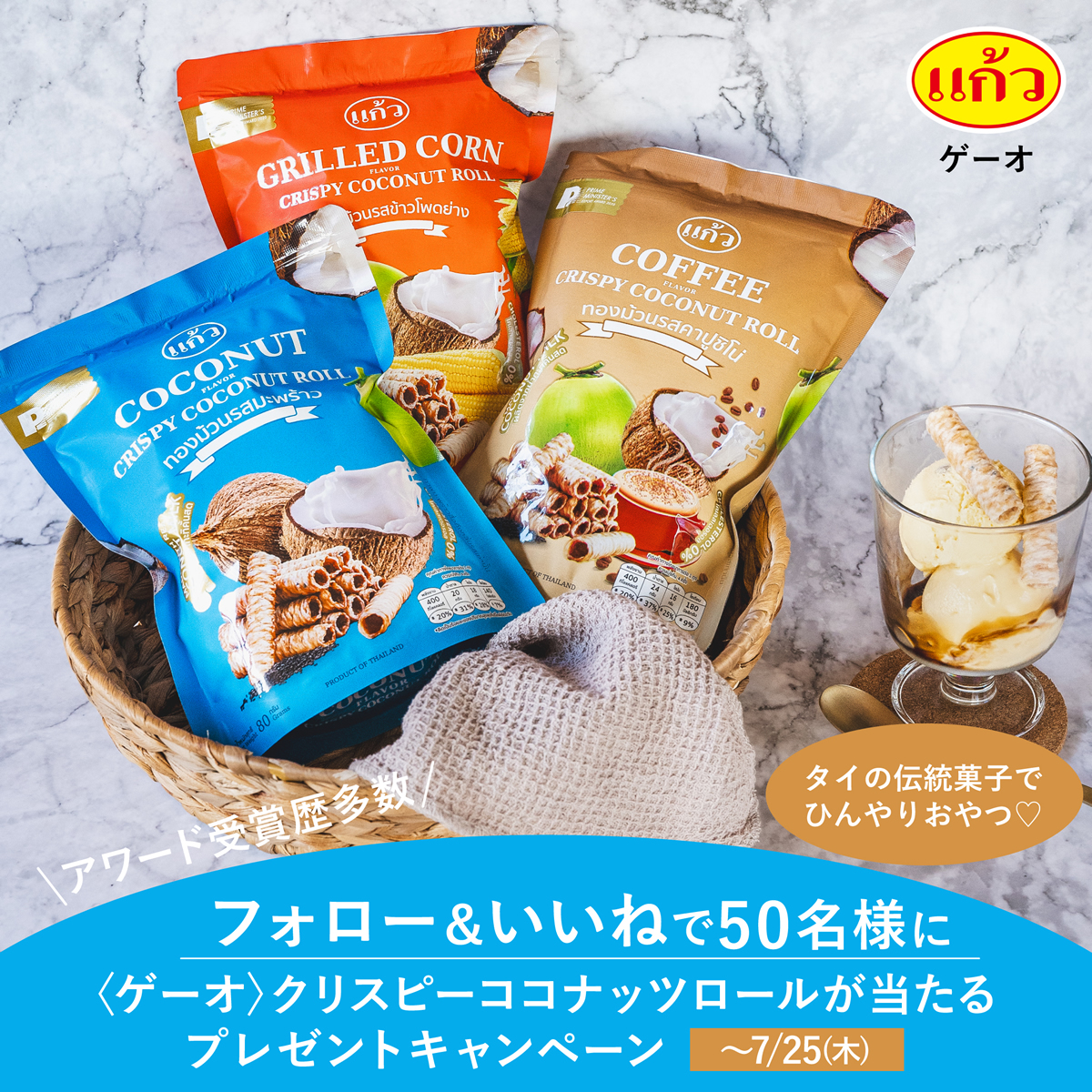 キタノ商事株式会社(本社:大阪府大阪市、代表取締役社長:木村谷和宏)は、2024年7月5日(金)より、キタノ商事株式会社公式インスタグラム @kitano_kk にて、タイ発〈ゲーオ(Kaew)〉クリスピーココナッツロールのセットが当たる「ゲーオ・クリスピーココナッツロール プレゼントキャンペーン」を開催します。