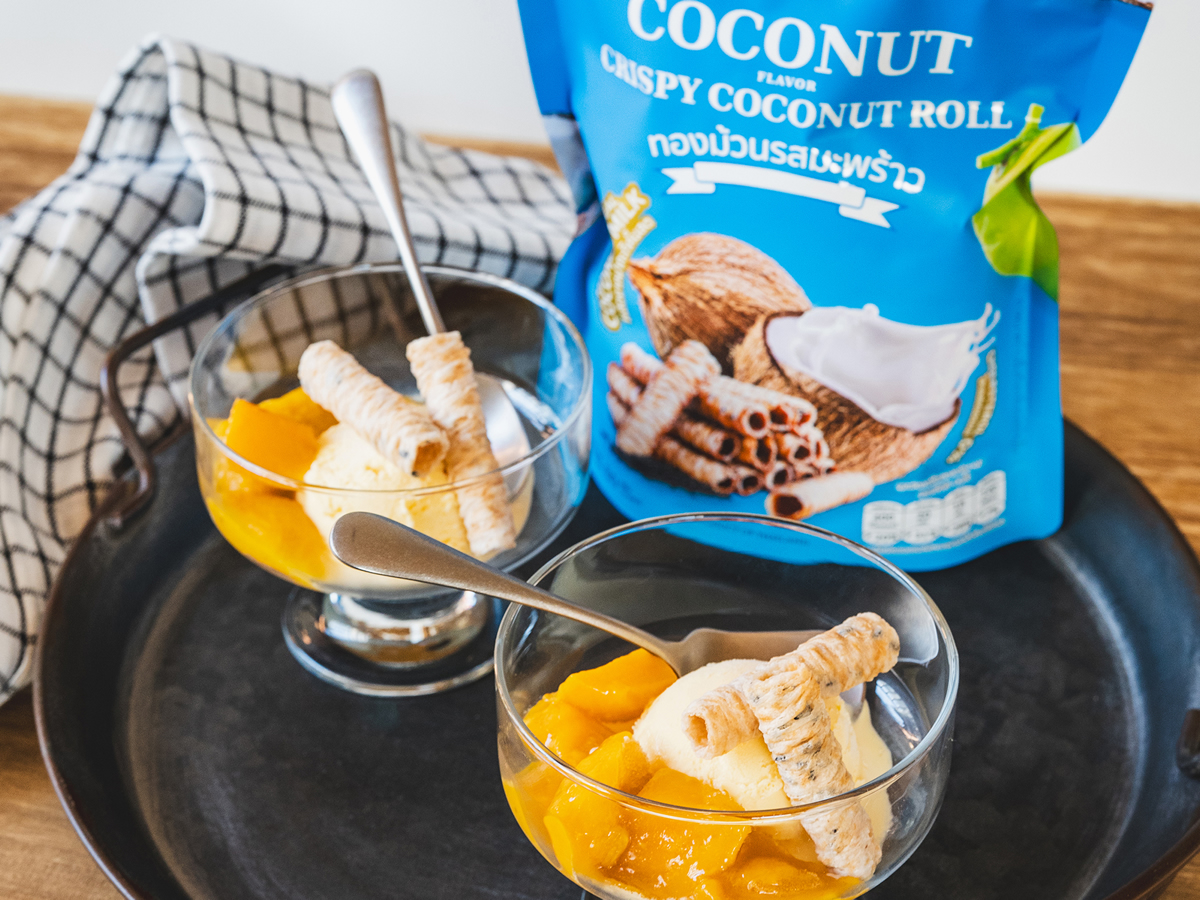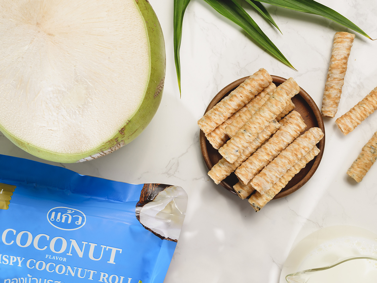 タイ発ローカルスナックブランド〈ゲーオ(Kaew)〉のクリスピーココナッツロールは搾りたてのココナッツミルクを使用し、ロール状に巻いたサクサクのココナッツスナック。ココナッツが苦手な方でも誰もが口をそろえて「とにかく美味しい」と言うこの驚きの美味しさは、鮮度が命のココナッツを独自のステップで製造管理しているから。
