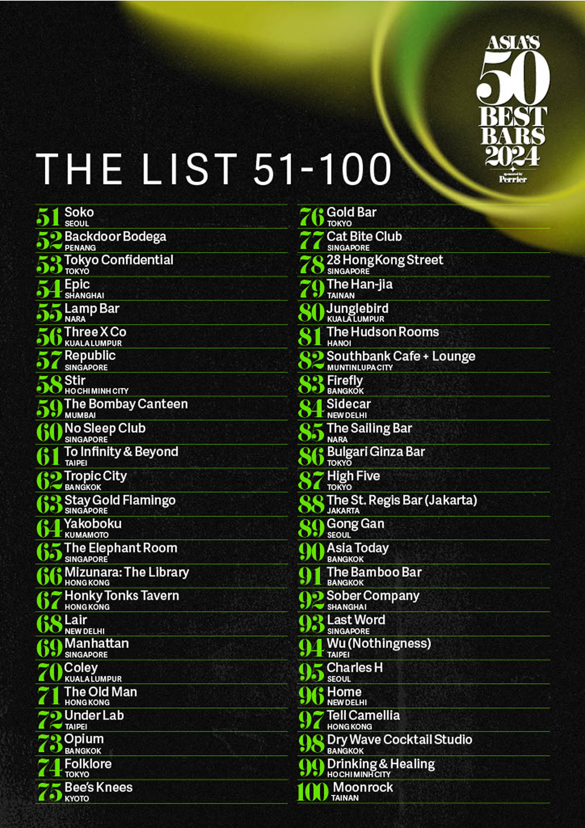 アジア各地のバーにスポットライトを当てる「Asia’s 50 Best Bars」は、Perrierの協賛を受け、今年で4年目となる名誉ある51st-100thのリストを発表しました。こちらは、香港でライブ開催される授賞式の1週間前に発表されるランキングで、バーテンダー、バーオーナー、ドリンクライター、カクテル愛好家で構成される男女比のバランスの取れた265名の有力なアカデミー会員が、「最高のバー体験」であると考えるサービスに対して匿名の投票を行うという、総合的な「Asia’s 50 Best Bars」投票プロセスから作成されます。
