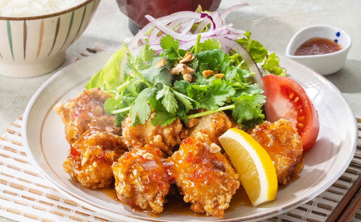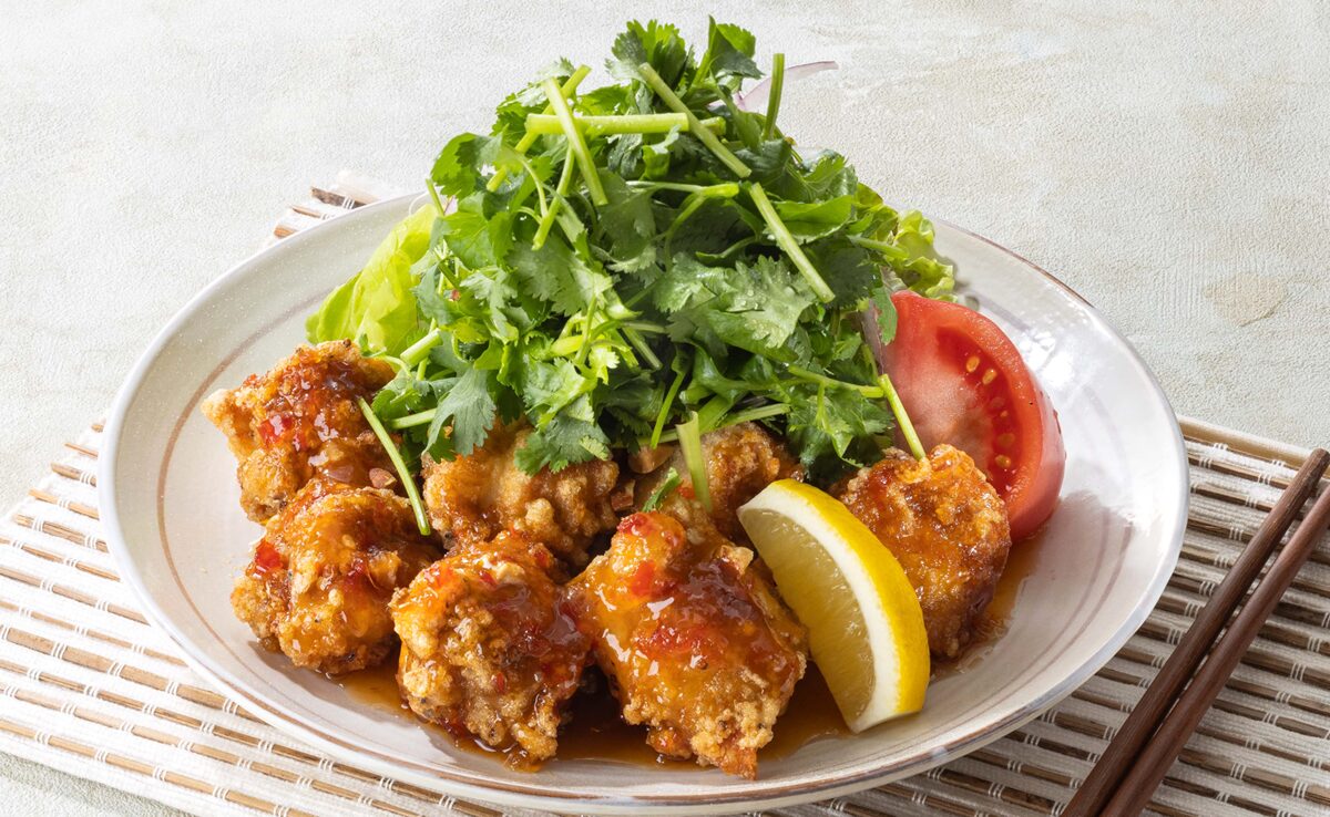 カリっとジューシーな大戸屋のおいしい唐揚げに、シーズニングソースとニンニクを効かせたスイートチリソースをたっぷりとかけました。パクチーと相性抜群で、食べ応えのあるエスニック風の唐揚げに仕上げました。ほどよい辛さとさっぱり感で食欲のない季節でもペロリと食べられます。