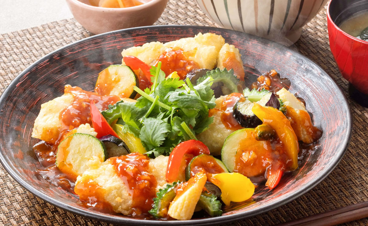 カラッと揚げたスケソウ鱈にヤングコーン、ズッキーニ、ゴーヤ、パプリカなどの夏野菜をたっぷり使用したスパイシーな甘酢あんかけです。チリパウダー、クミン、オレガノなど数種類のハーブやスパイスを加えた甘酢ソースは、やみつきな旨辛味でご飯がすすみます。