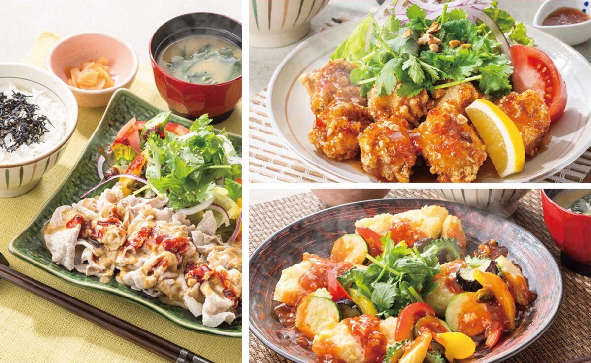 色鮮やかな見た目と、パクチーの香りが食欲を刺激する『アジアングルメ』。甘辛なスイートチリソースがクセになる美味しさ「スイートチリの大戸屋アジアン唐揚げ」(定食価格:税込1,180円)。数種類のハーブやスパイスを加えた甘酢ソースでご飯がすすむ「夏野菜とスケソウ鱈のピリ辛甘酢」(定食価格:税込1,350円)。濃厚胡麻だれと特製ラー油でさっぱりピリ辛な「豚の冷しゃぶと彩り野菜としそひじきご飯」(定食価格:税込1,430円)。メニューに使っている食材には、からだにうれしい栄養がたっぷり。程よい辛さで爽快感抜群な大戸屋の『アジアングルメ』で夏バテ知らずの体づくりを。