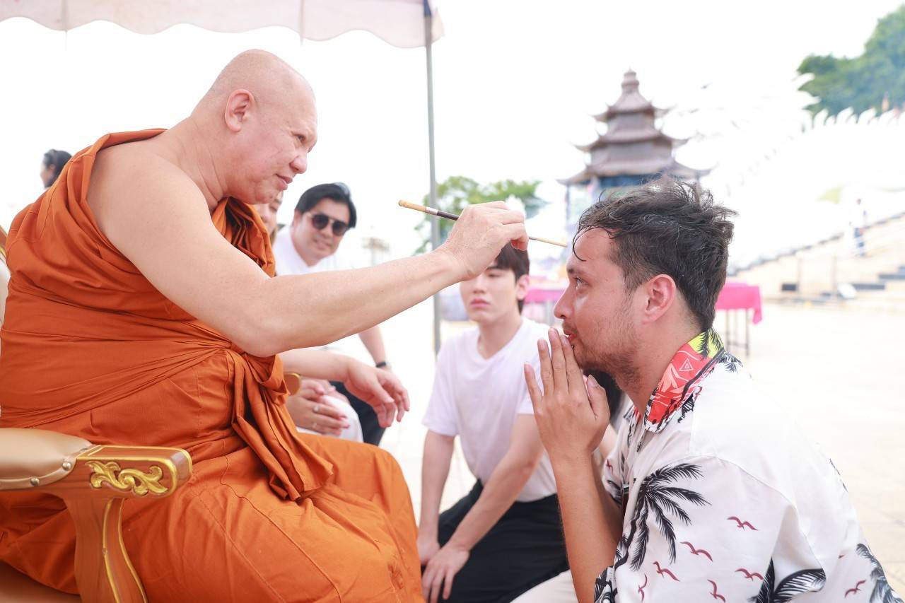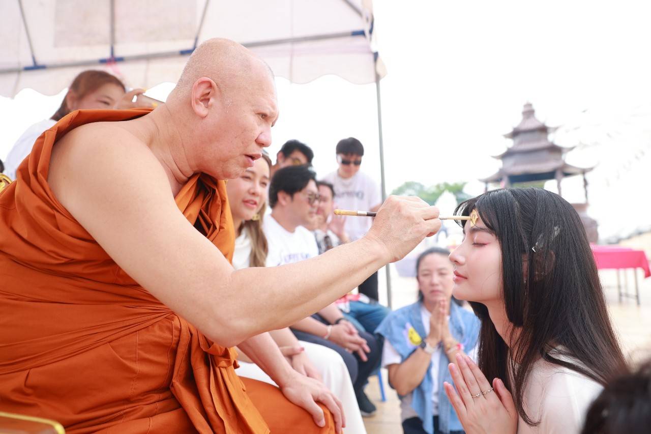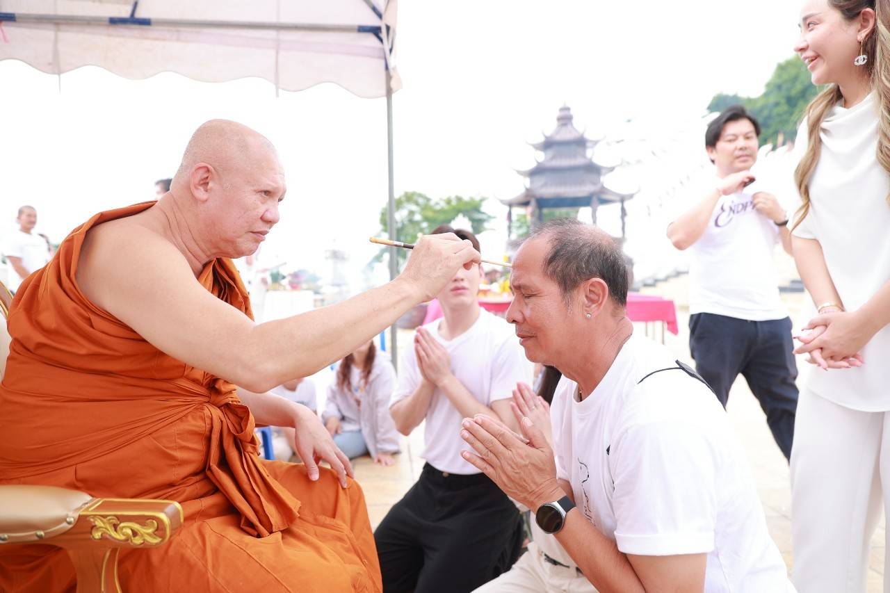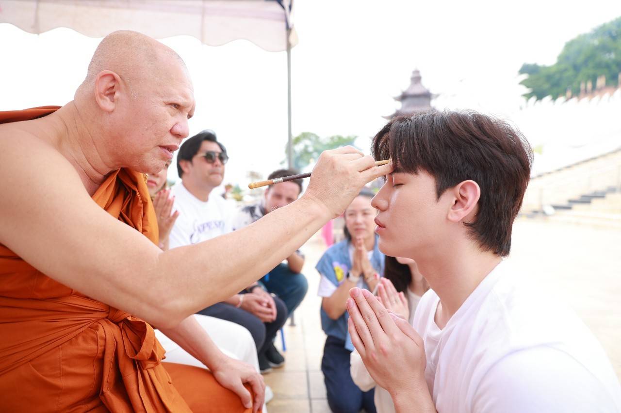 儀式の後、プラ・アーチャン・ポープチョーク師が慈悲をもって、主演俳優、監督、そして全スタッフの額に祝福の印をつけて運を呼び込み、タイ映画「ENDPRESSO ปณิธานหวานน้อย」の成功と視聴者からの人気、高収益、そして世界的な名声を祈願しました。