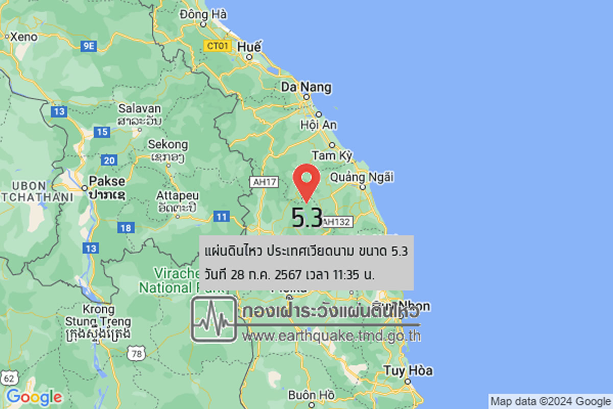 แผ่นดินไหว ประเทศเวียดนาม(14.95°N,108.21°E) ขนาด 5.3 ลึก 10 กม. วันที่ 28 ก.ค. 2567 เวลา 11:35 น. [TMD] https://t.co/71Ik5d79Wo