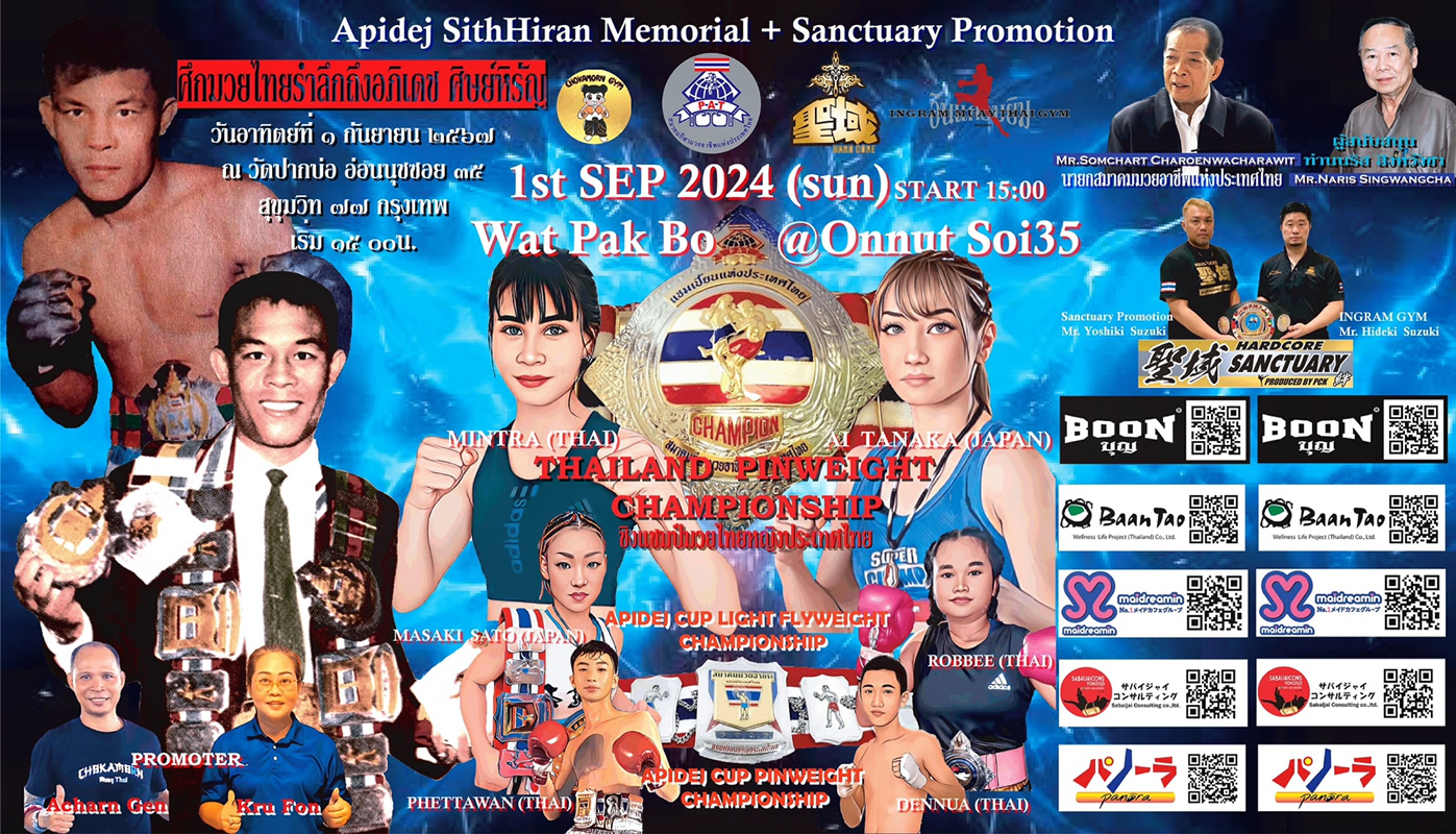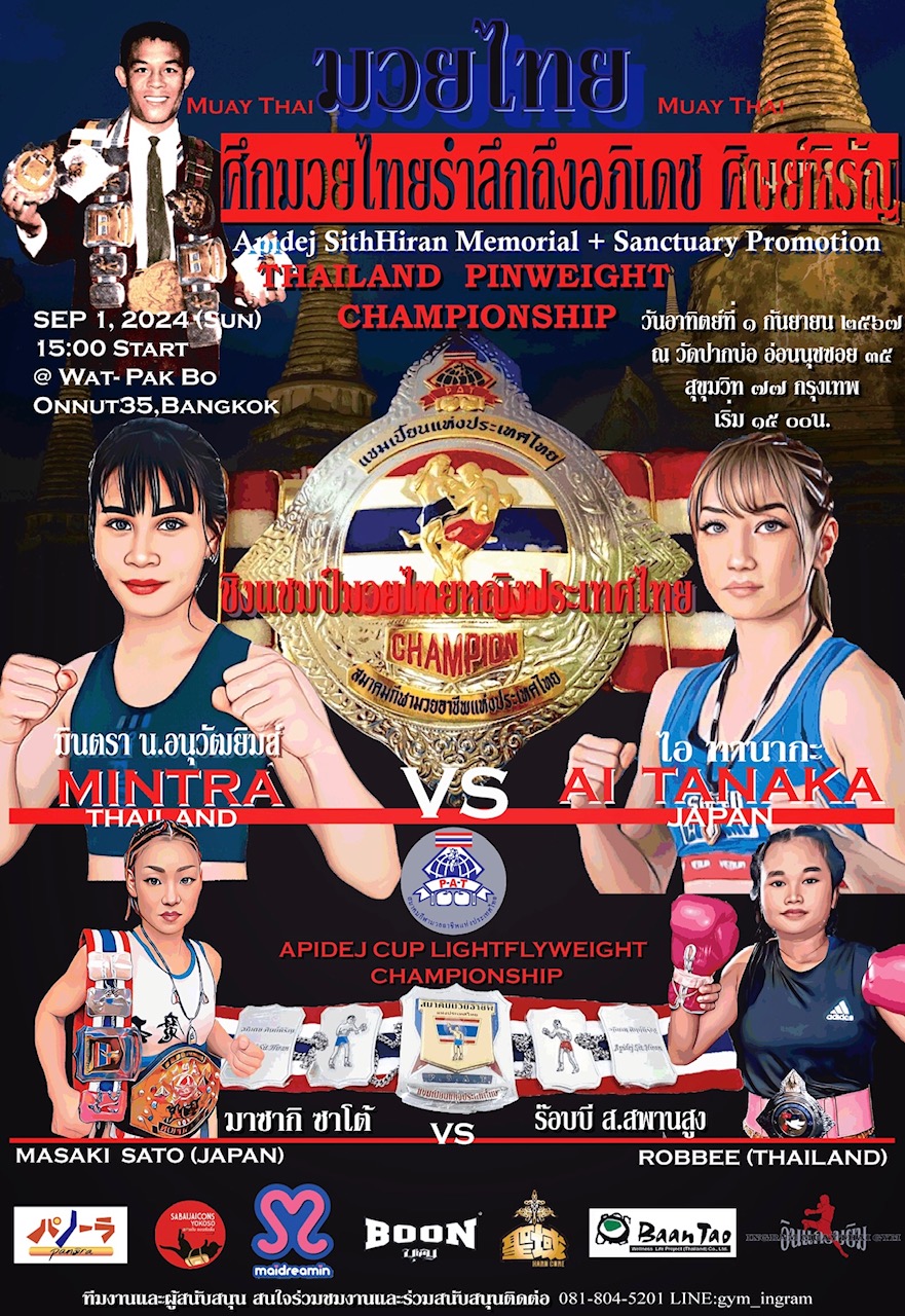 2024年9月1日(日)にバンコクで開催されるムエタイ興行のメインイベントにて、女子軽量級世界最強と評される、田中”暴君”藍(WPMF世界ピン級王者/ PCK亘理 / L’antre du Lio)が出場し、ミントラー・ノー.アヌワットジム(タイ)との間で空位のタイ国プロムエタイ協会(PAT) *⒈ 女子ピン級(100ポンド)の王座決定戦として行われることが決定しました。観戦無料。