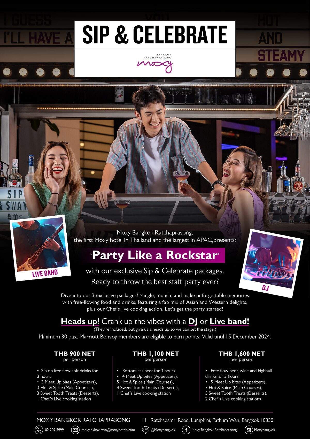 2024年8月5日 – バンコク、タイ – タイの首都バンコクの中心部に位置するMoxy Bangkok Ratchaprasongは、アジア太平洋地域で初めてかつ最大のMoxyホテルとして、「ロックスターのようにパーティーをする」パッケージと料理の提供を開始しました。年末の祝賀会、会社の集まり、社交イベント、外出などを計画しているゲストにぴったりの特別なプロモーションで、どんなイベントも忘れられないものにする特別な取引を提供します。広々としたデザイン重視の室内エリアと、バンコクの美しい景色を望む屋外テラスを備えたMoxyは、次のイベントのための究極の背景となります。