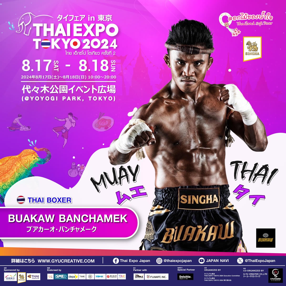 東京・代々木公園にて2024年8月17日(土)8月18日(日)開催される、日本最大級のタイポップカルチャーイベント「タイフェアin東京~THAI EXPO TOKYO 2024(タイエキスポ)」に、ムエタイ界のレジェンド 「BUAKAW BANCHAMEK(ブアカーオ・バンチャメーク)」の参加が決定しました。当日会場ステージにて、ムエタイのスペシャルパフォーマンスはもちろん、試合前の勝利を祈る舞「ワイクルー」や歌唱パフォーマンスなども披露します。