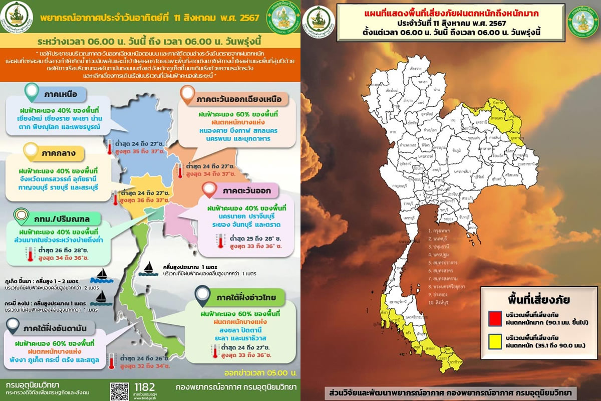 南部(東海岸): 地域の60%で雷雨が予想され、特にソンクラー、パッタニー、ヤラー、ナラティワート県で大雨が降る見込みです。最低気温は24-27℃、最高気温は33-36℃で、南西の風が15-30km/hで吹き、海では波の高さが約1メートル、雷雨のある場所では波が1メートルを超える可能性があります。