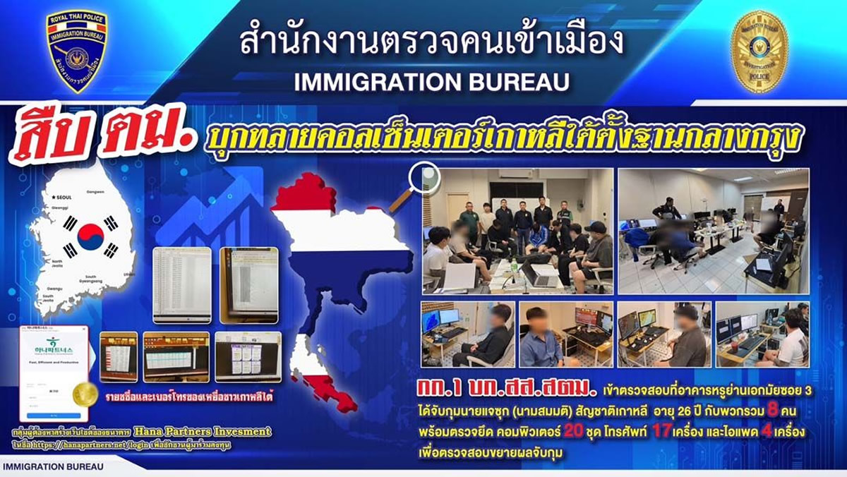 タイ入国管理局は2024年8月22日、バンコク・エカマイ通りソイ3のビルの一室に拠点を設置して活動していた韓国人特殊詐欺グループを摘発し、8人の韓国人を逮捕したと発表しました。