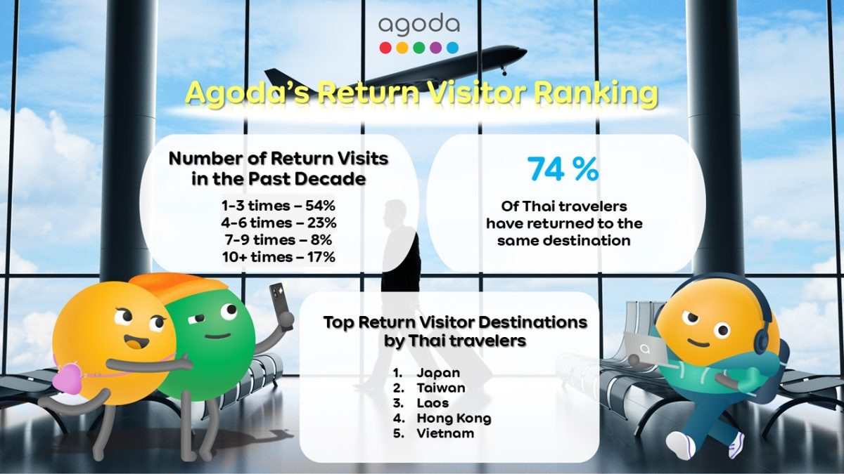一度の日本旅行では満足できない人が多いことがわかりました。Agodaの最新リピート訪問ランキングによると、タイの旅行者の74%が好きな旅行先に何度も戻っていることが明らかになりました。2024年8月初めにAgodaプラットフォーム上で実施された調査をもとにしたこのランキングでは、日本、台湾、ラオスがリピート訪問者の間で最も人気のあるホットスポットとしてトップを占めており、その後に香港とベトナムが続いています。