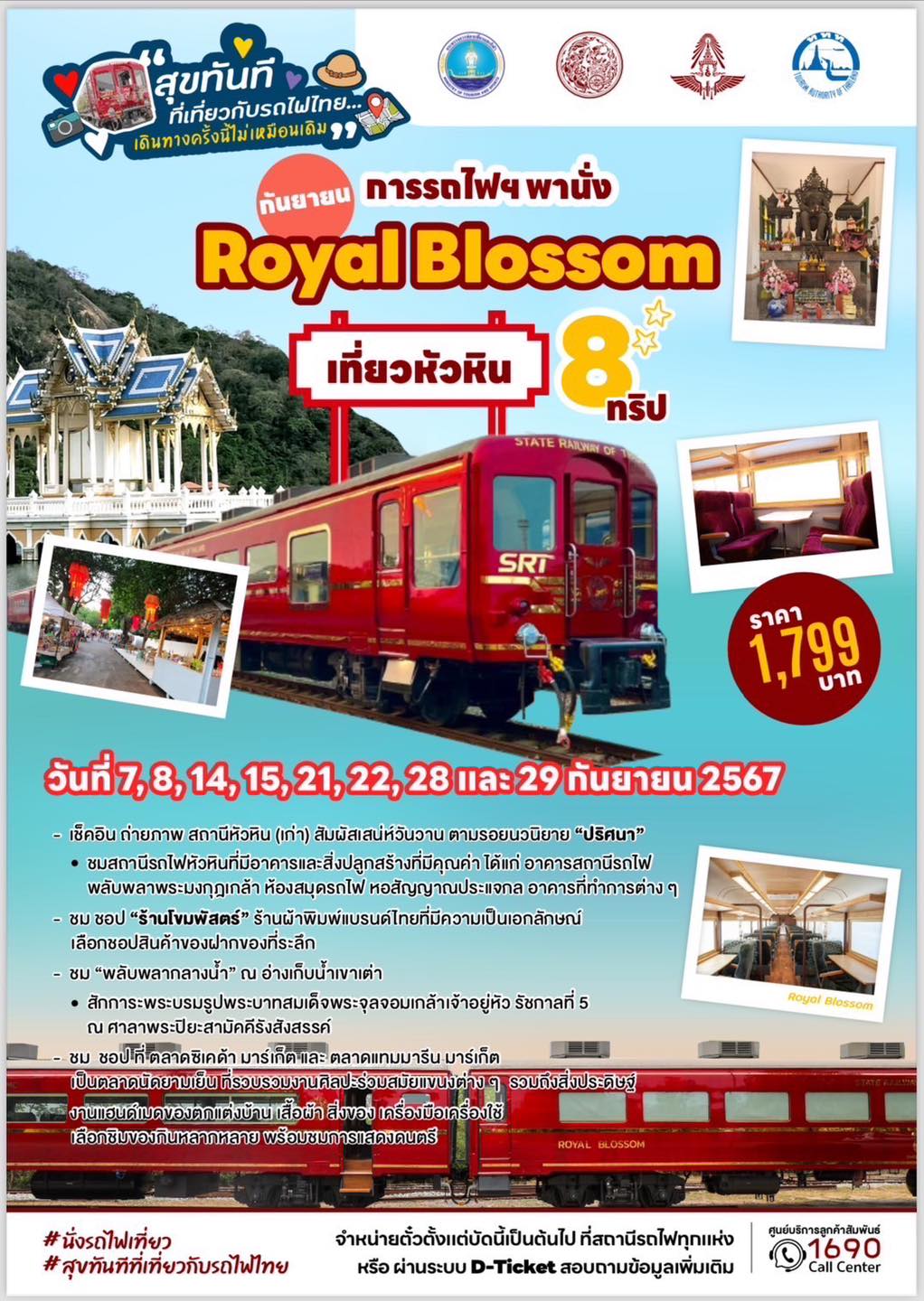 「ROYAL BLOSSOM」ムは、バンコク(フアランポーン駅)を午前6時45分に出発し、ホアヒン駅には午前10時30分に到着します。ホアヒン駅(旧駅)では、歴史ある建物やロマンチックな物語「プリッサナー(ปริศนา)」の舞台を楽しめます。また、写真撮影やランドマーク作り、または建築物や歴史的な建造物を鑑賞し、その後、「クルアバーンクル(ครัวบ้านครู)」レストランで昼食を楽しみ、ホアヒンのビーチサイドのシックな雰囲気に浸るなどなどの充実の旅行。帰りの列車は午後5時53分にホアヒン駅を出発し、午後9時55分にバンコク駅に到着します。途中、バンスー駅、バーン・バムル、タリンチャン駅、サーラヤー駅で乗り降りできます。